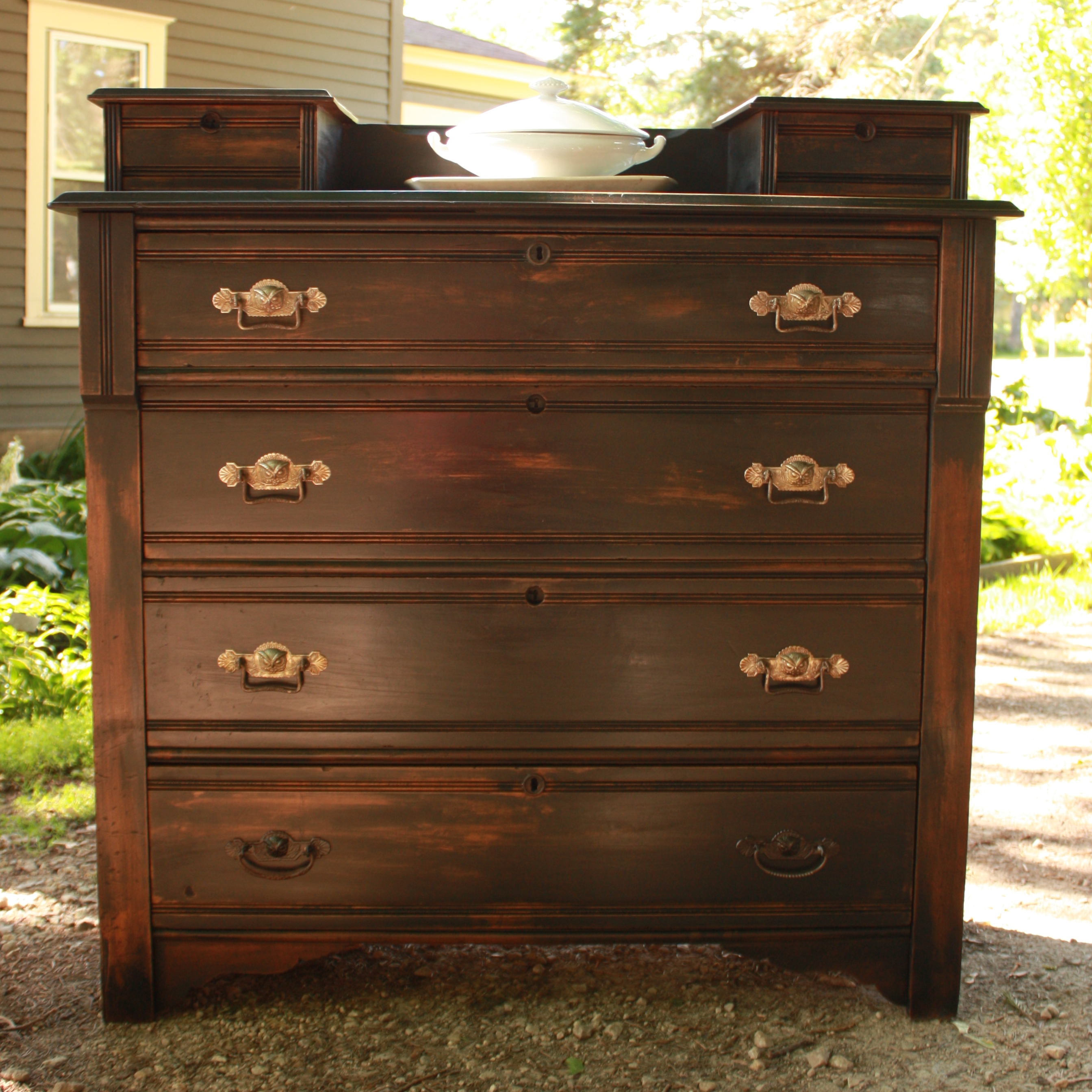 Then, I did something really crazy.  This is the point where I have to swear you to secrecy.  Do not reveal my method!  I painted the whole thing with satin black spray paint.  After allowing it to dry for about 30 minutes, I then used a rag to apply paste wax.  The wax takes off some (or maybe a lot) of the paint.  This method is not for the faint of heart.  It’s messy, and you never know what kind of result you might get.  For this dresser, the result was fantastic!