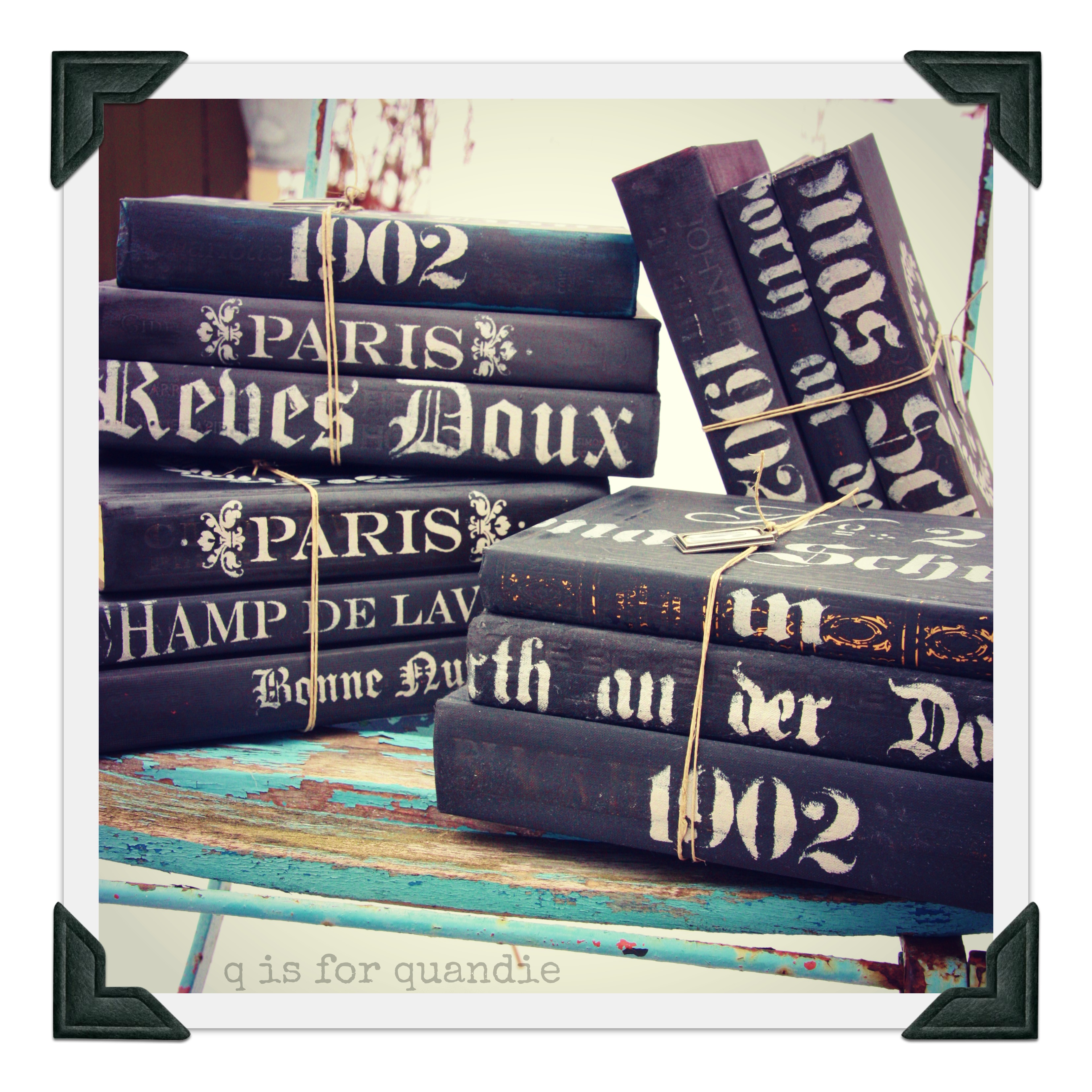 These are just random hard cover books painted black (with Miss Mustard Seed’s milk paint in Typewriter), then stenciled in a very pale grey.  I sanded them slightly, and this time I added some hemp oil to seal the finish.