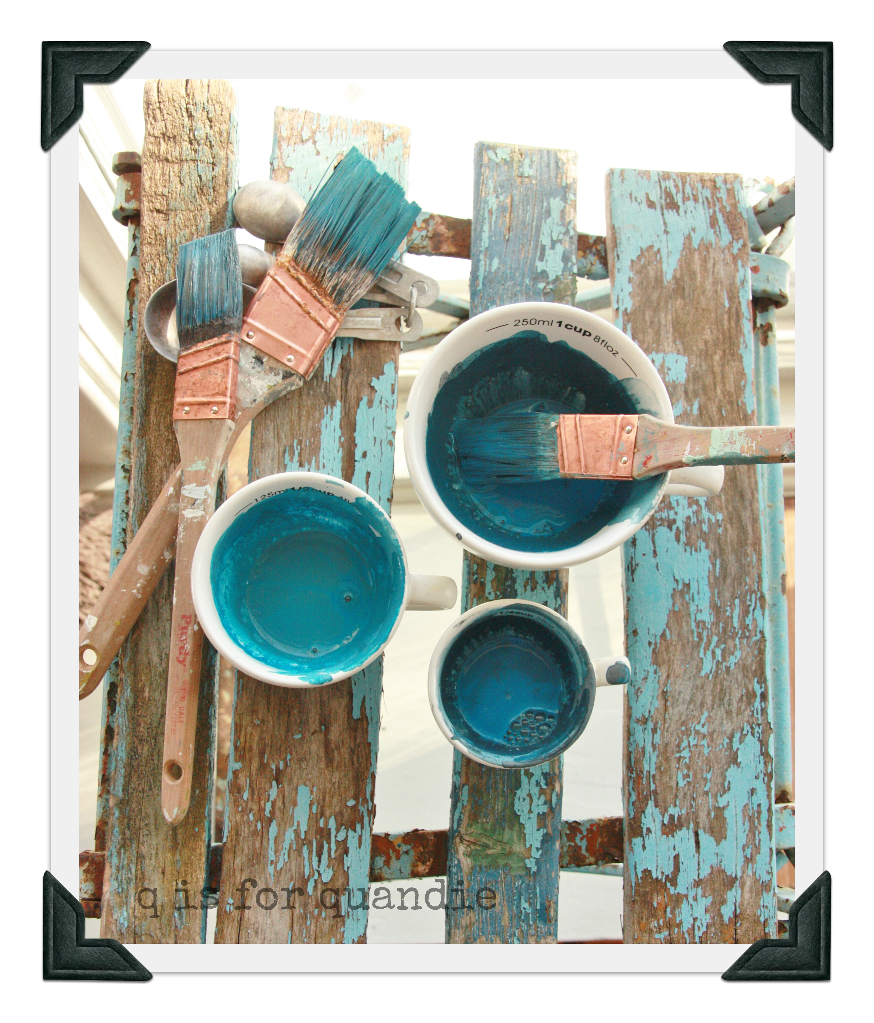 blue mixologyIn this picture you are seeing Flow Blue on the left, Artissimo at the bottom, and a mix of the two at the top.  I find that you don’t really get a good feel for the colors by just adding the water and mixing.  So I pulled out an old piece of wood and painted each color on.  I ended up doing about 5 coats because the wood was very porous and just drank up the paint.