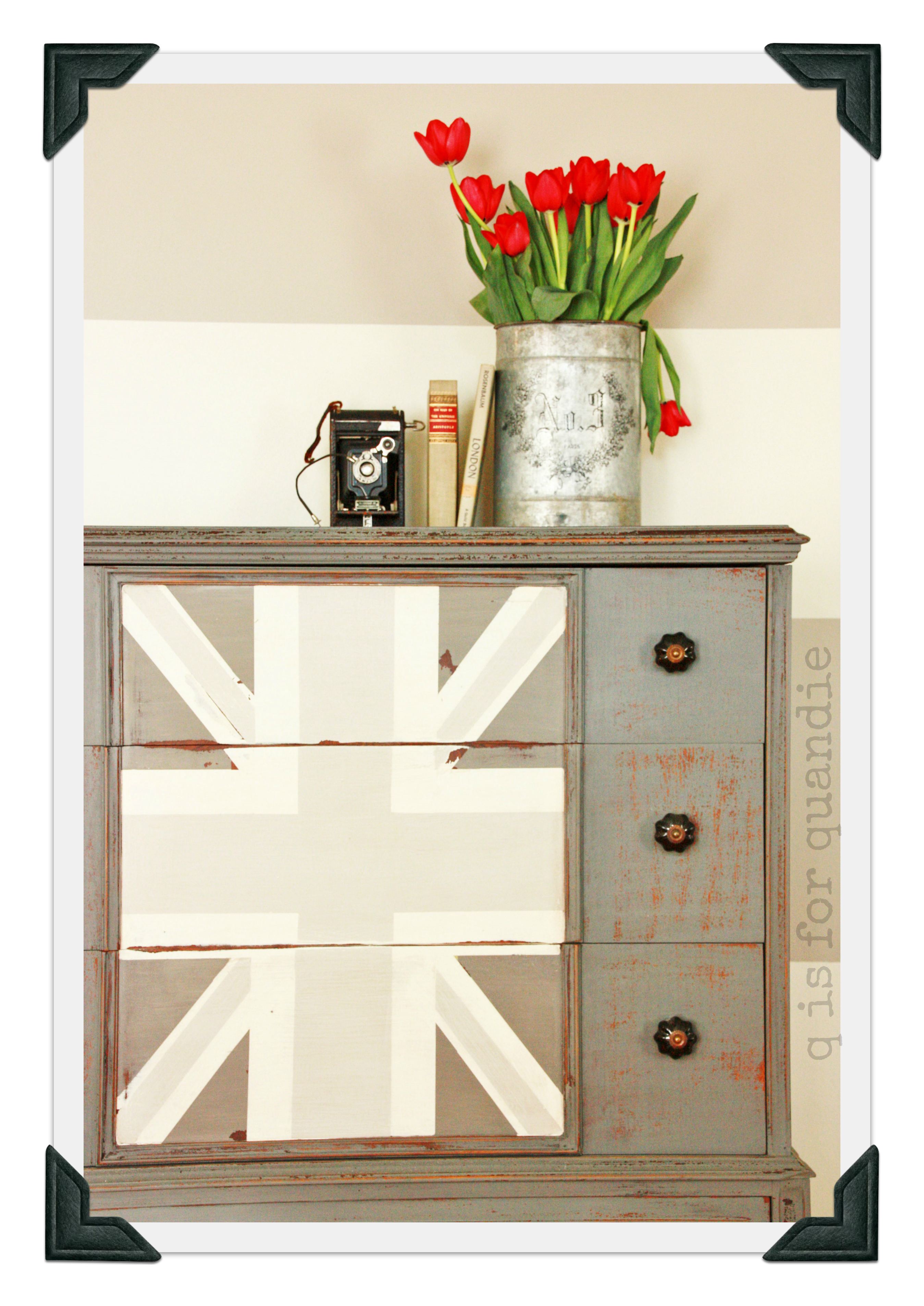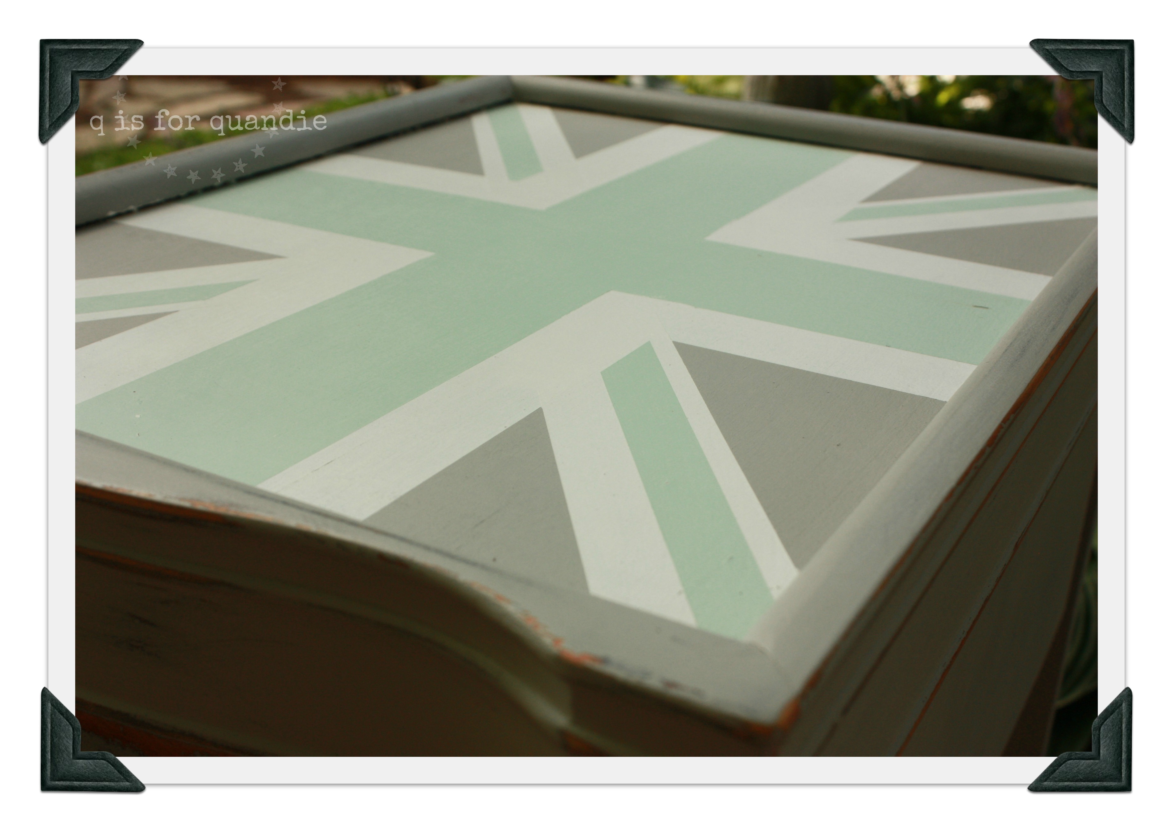 Boring details:  painted with MMS milk paint in Trophy.  However, if any of you have ever tried to use tape on milk paint, you know that they don’t mix.  So, I added bonding agent to the Trophy just in the rectangular section that became the Union Jack.  I wanted the rest of the dresser to chip and distress, but I didn’t want to pull the paint off with tape while adding my flag.  I will warn you that even with the bonding agent, I lost some chunks of paint.  I also peeled the tape off very, very carefully.  The white is latex, and the pale grey on top is a mix of the white latex and the Trophy with bonding agent.  I won’t continue to bore you with the details of painting the jack, let’s just say that far too much Frog tape went into my local landfill after this.