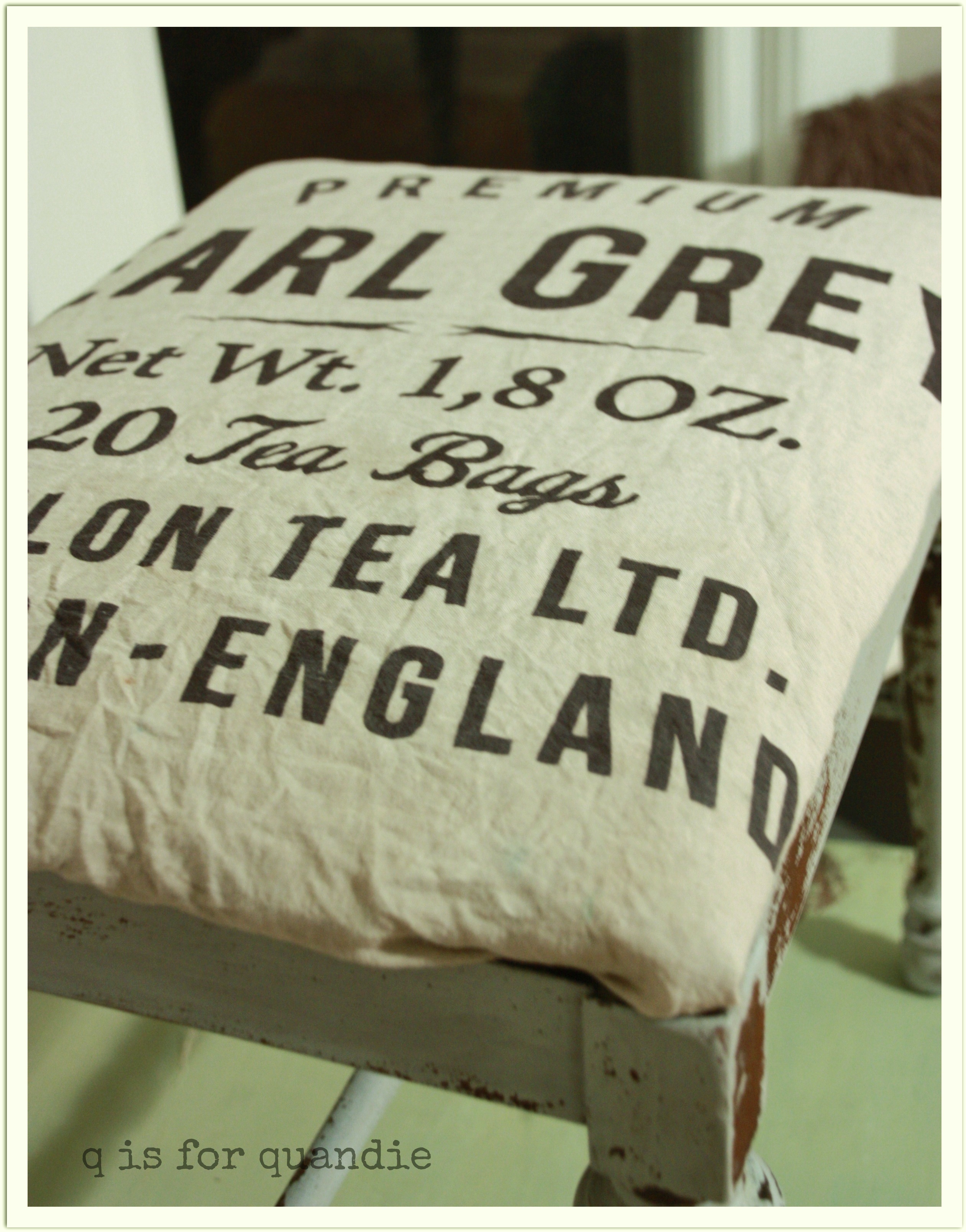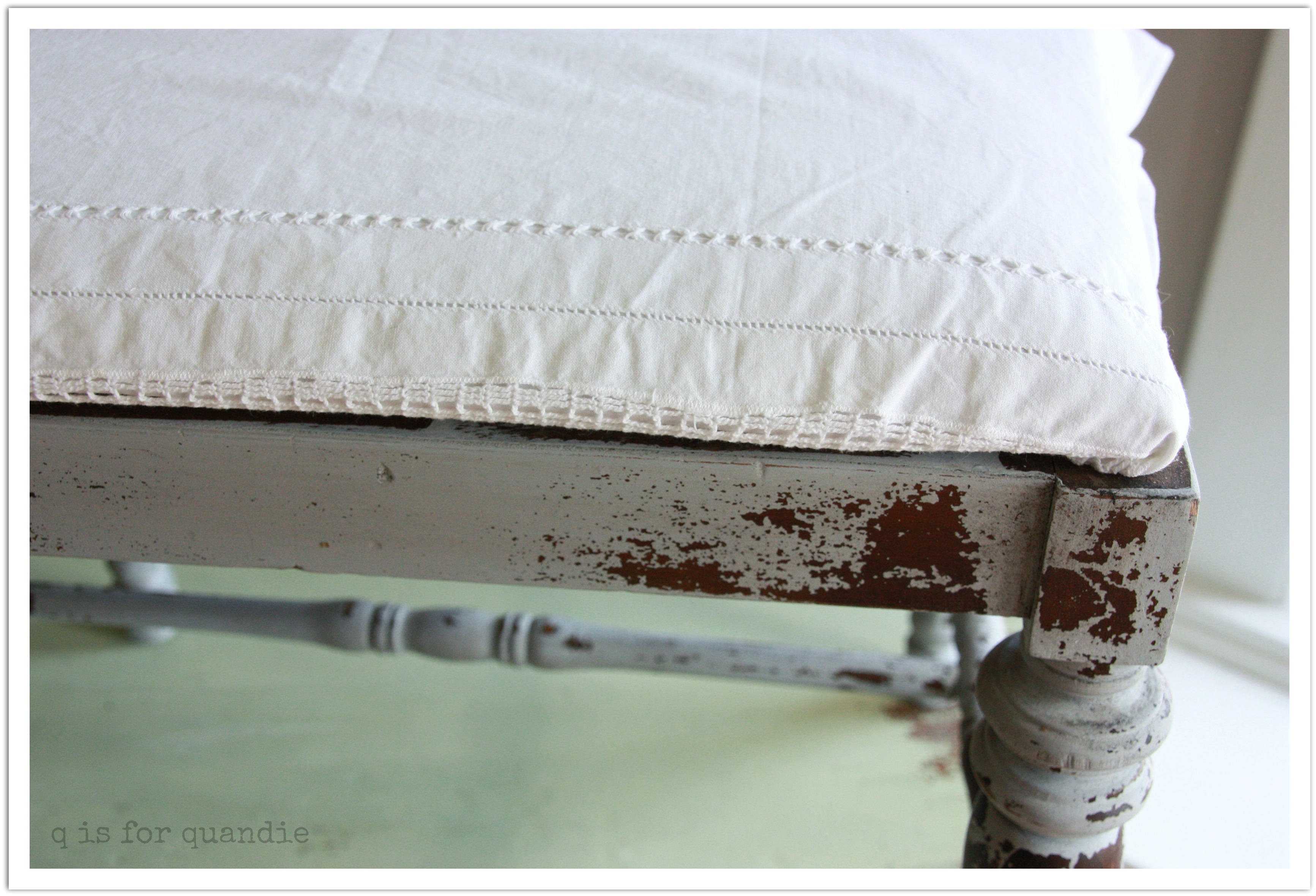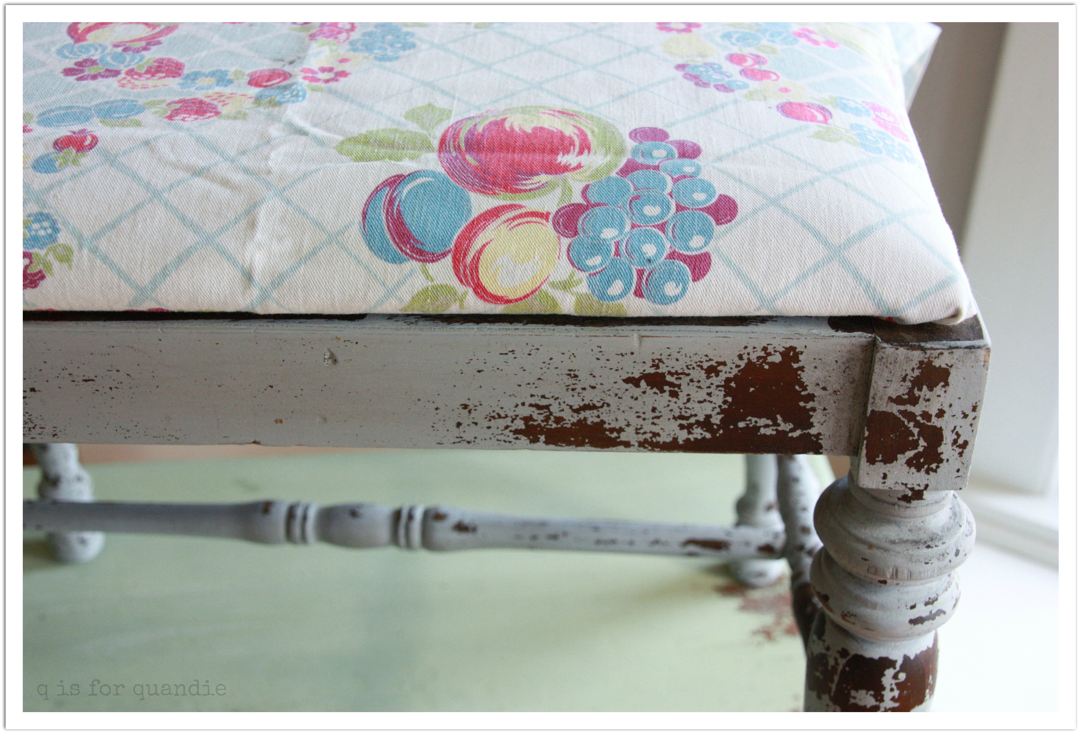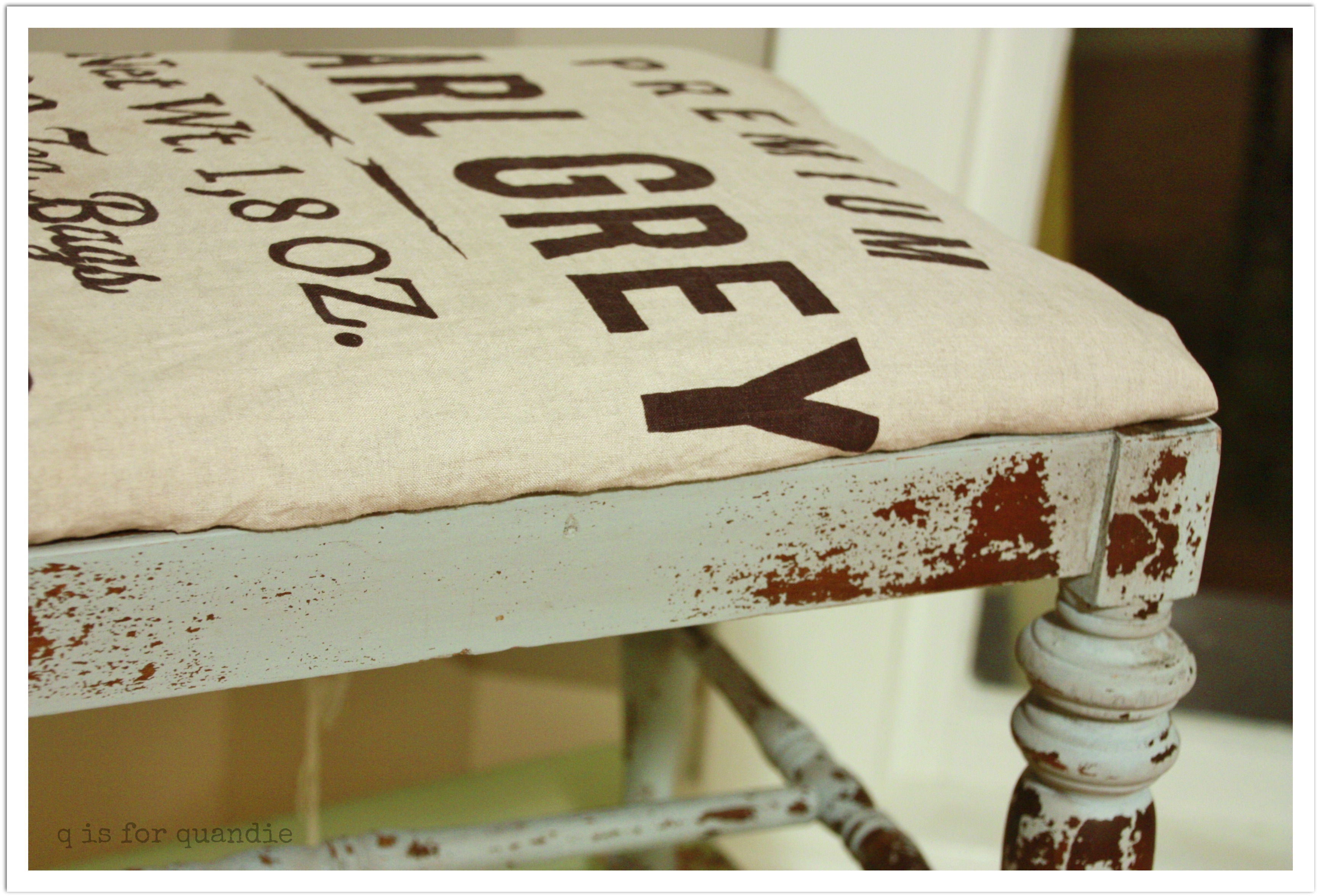 I think the grain sack color is too warm next to the cool tone on the bench.  Otherwise, I like the idea of the grainsack, and I even like the patch on it.  It’s the perfect amount of scruffy to work with the chippy paint job.