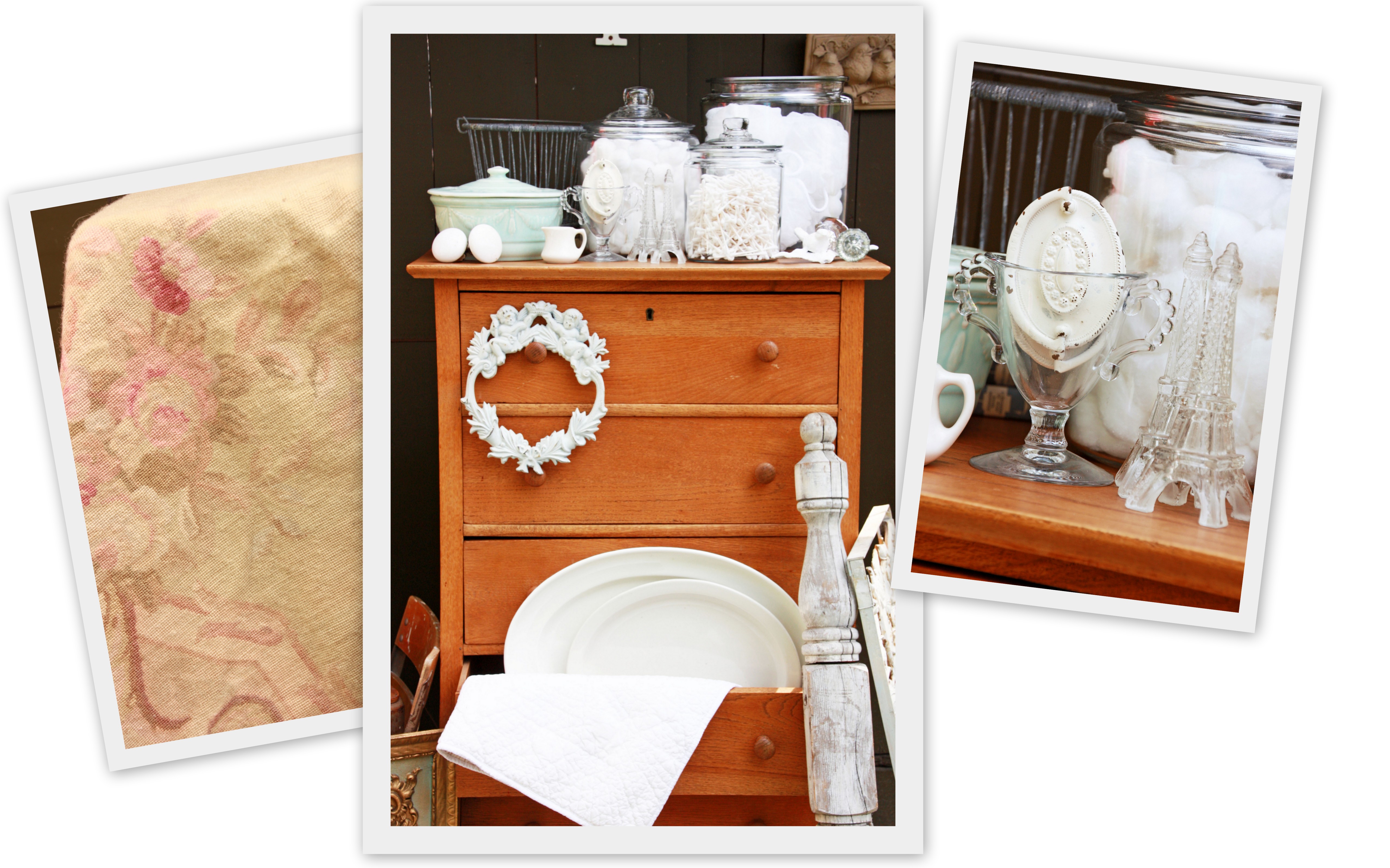 Love the door knobs and plates and the scale. I collect old books like those too. They are great to create vignettes with. The rug Bee Knees snagged has quite a story. The photo with dresser merchandised with the ironstone platter and glass jar canisters is really well done.