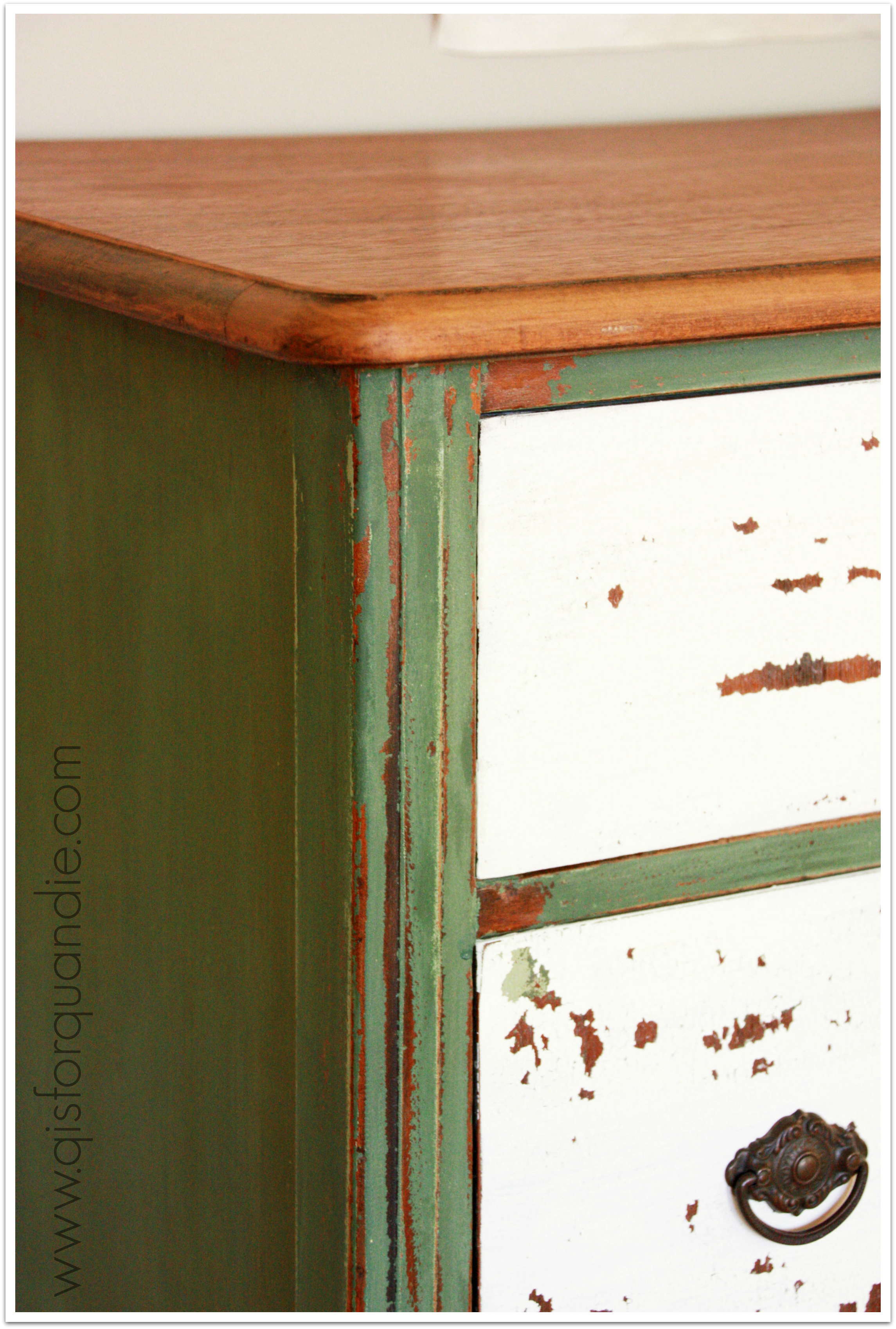 You can see that in most spots I got chipping right down to the wood on the drawers, but some spots just chipped to the green undercoats.