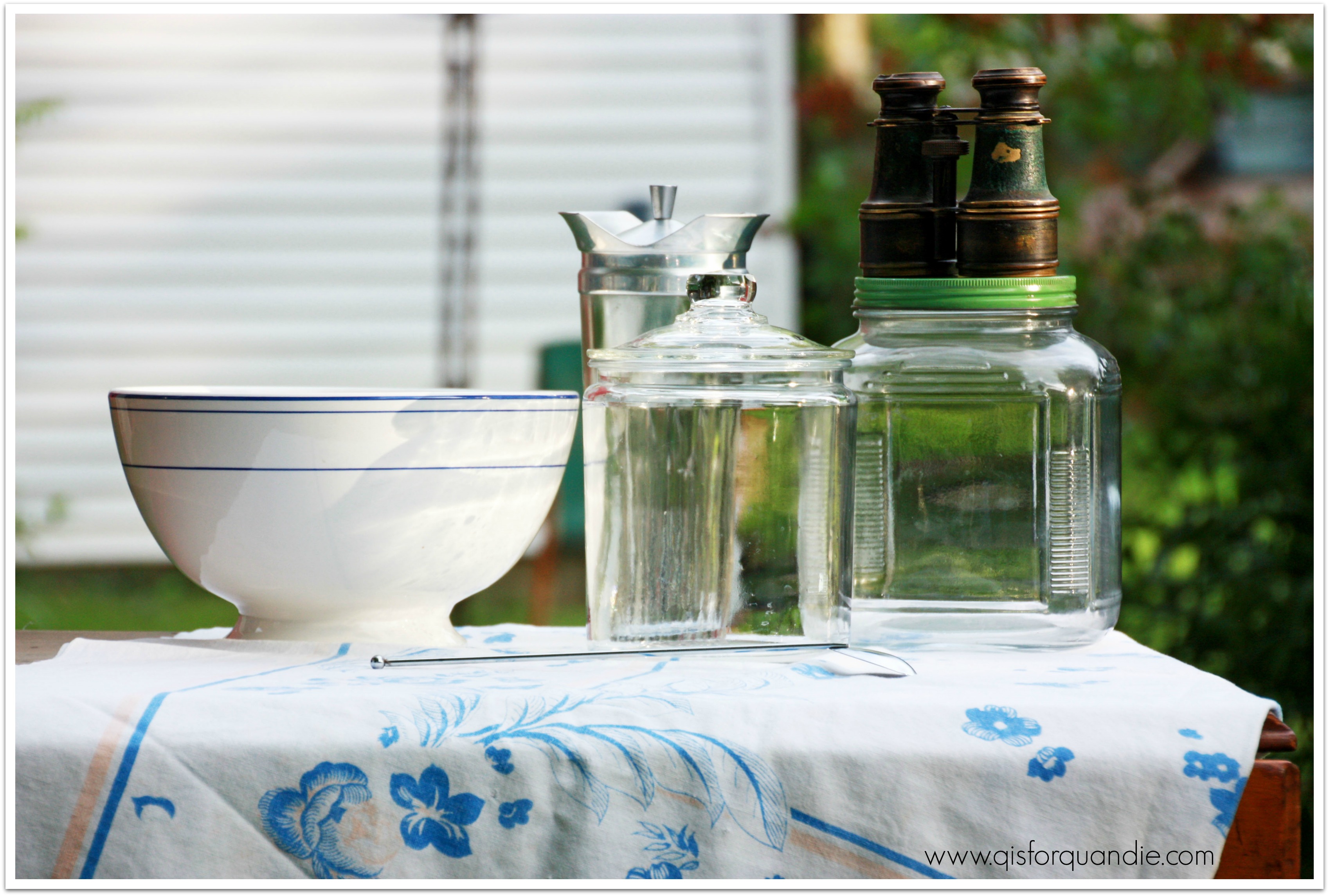 Whoa you are one dedicated garage sale shopper! Rain boots are on my list to buy. I just have not found the right ones at the right price. Perhaps the extra “c” is for community? Have to second Darrielle’s comment “Great Haul”! My favorite item the binoculars I never ever see those at garage sales – good eye. I also use both the glass canisters and the square jars in my pantry. I would love to take everything out of a box or bag and put in one of these guys. I store rice and oatmeal in the screw on lids jars. Just makes me happy to open the pantry minus advertising labels. I know I have a screw loose. The mini curio is cute are you thinking of repurposing it? And the table has promise I one similar turned into a potting table a couple of years back.