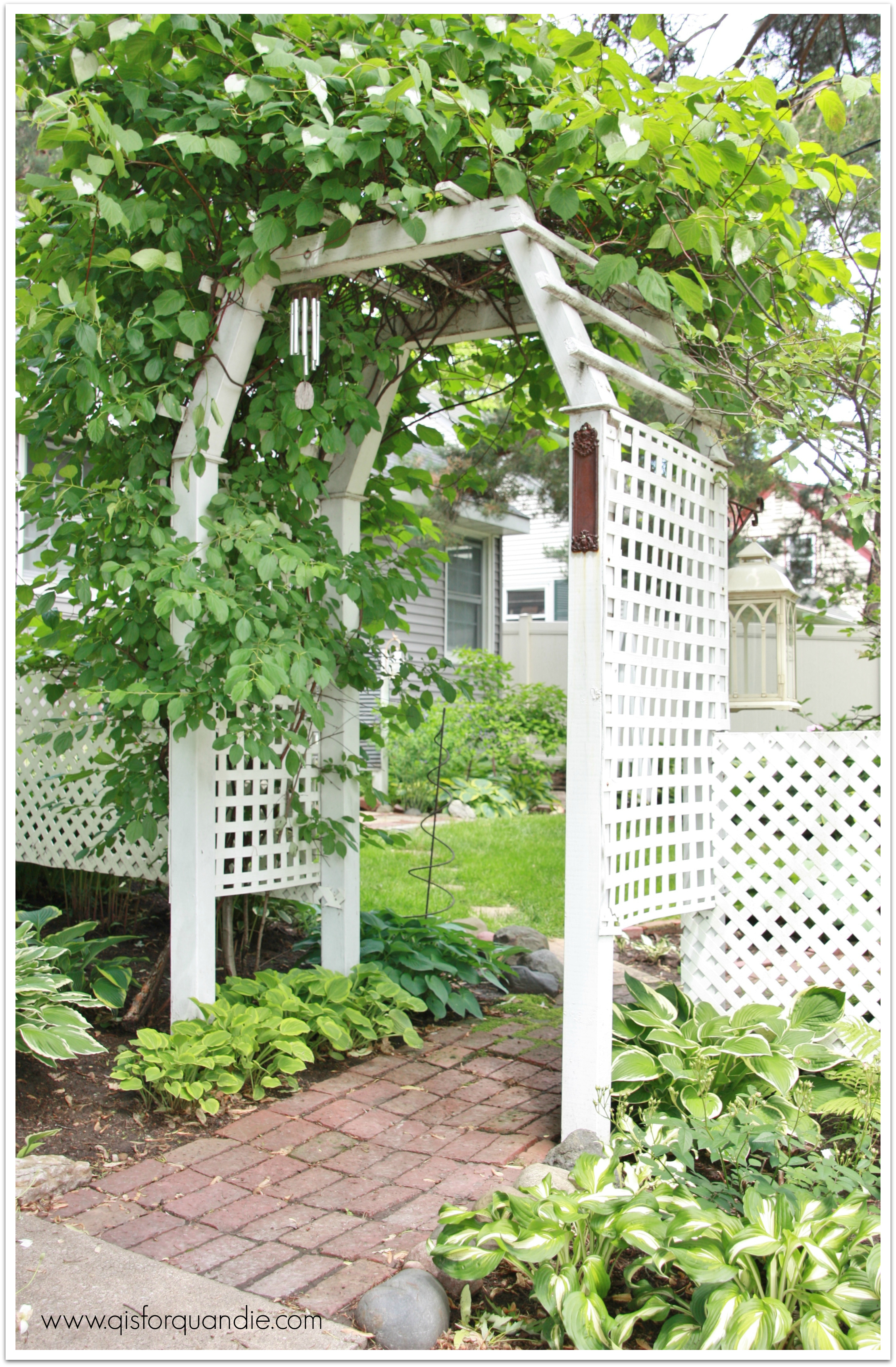 2. The trellis idea is brilliant and the whole garden is inspiring. I love the mossy brick paths and all the hostas one of my favorite plants I finally put in 5 last year. But the bench full of watering cans be still my heart. I want one too!