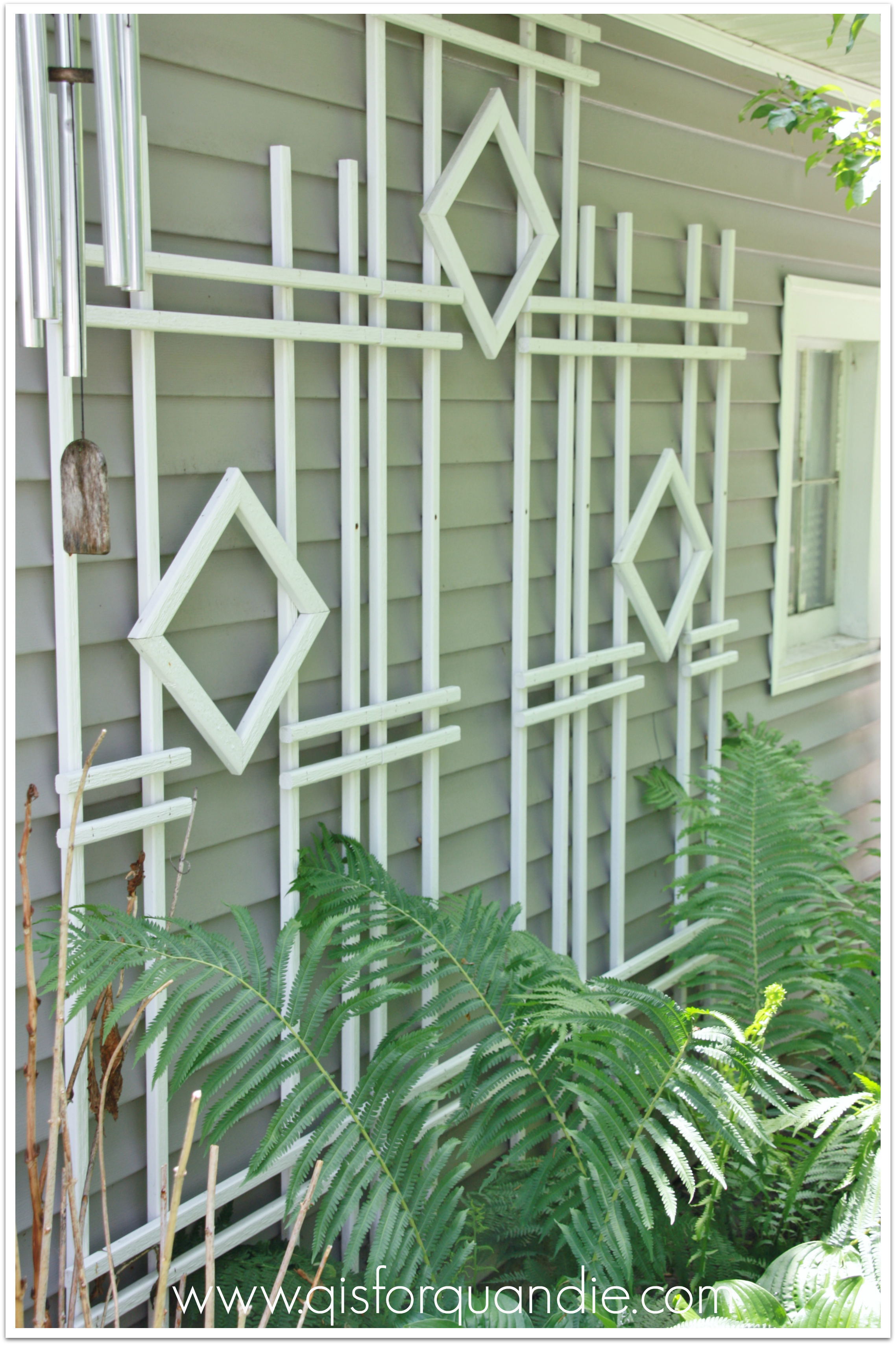 This trellis is arranged on the detached garage wall that borders one side of the garden.  Isn’t it clever?  It’s just 3 standard trellises arranged in an offset way to create this pattern.  I might have to borrow this idea for the side of my carriage house.  Is that OK Sue?