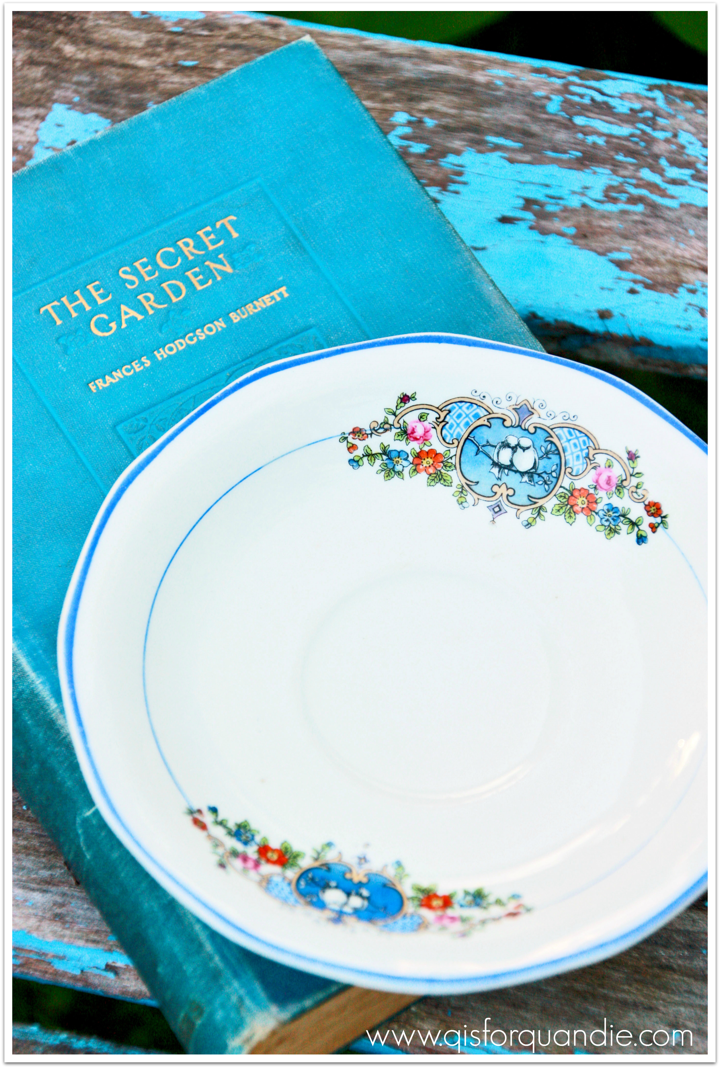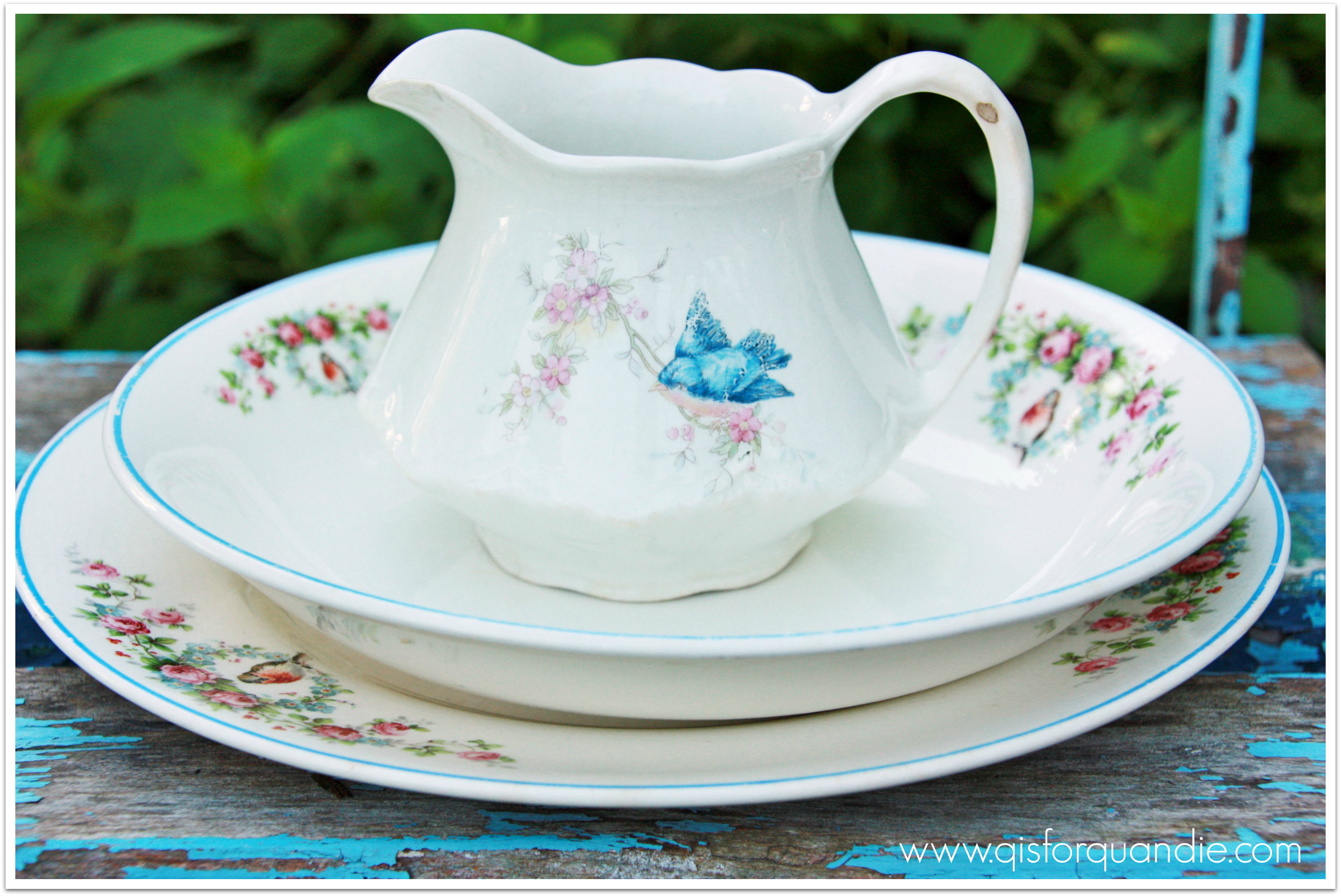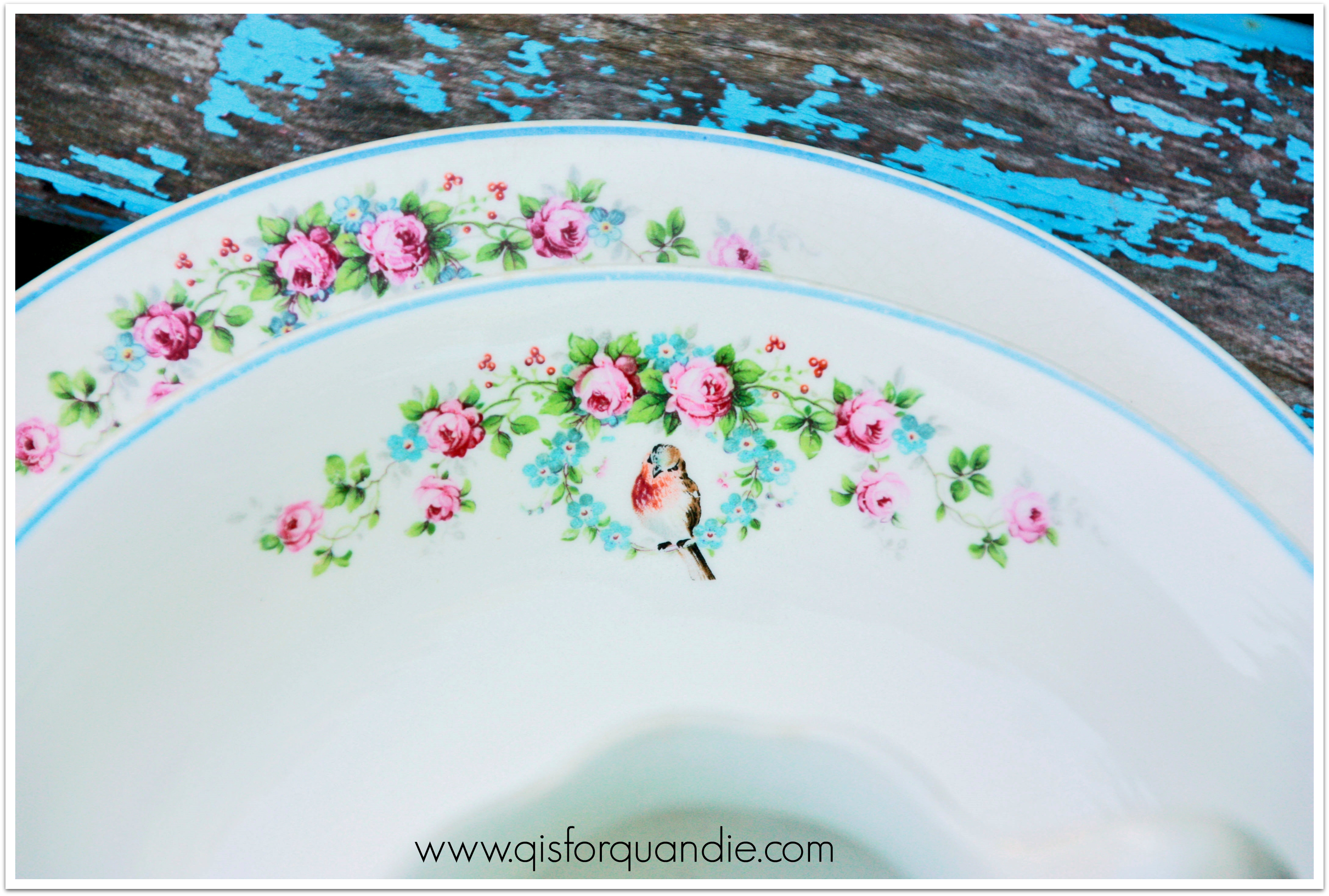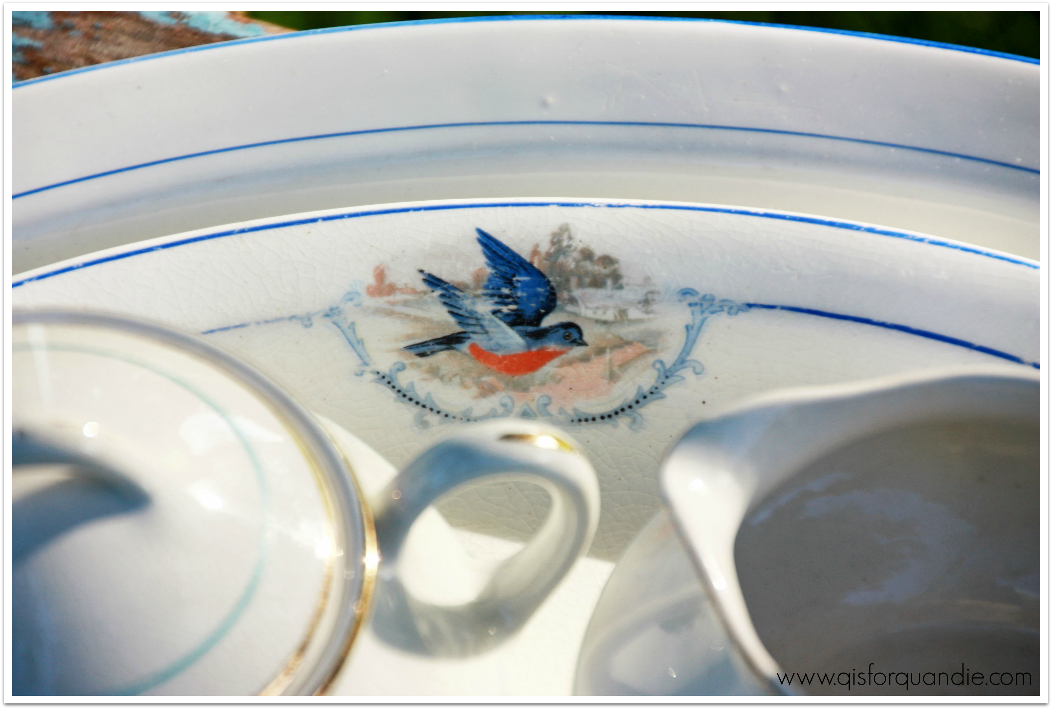 Clearing out the summerhouse to make way for a furniture photo studio means getting rid of most of the things I had out there.  The cane back sofa sold really quickly on craigslist.  The wicker chair was quick to go at my Carriage House sale.  But I also had a lot of vintage china out there.  I cleaned up most of it and attempted to sell it at my sale, but not much of it sold.  Sue is considering holding a shabby chic china sale at her house this summer, but if it still doesn’t sell, I may try to find one of those wedding rental companies that rents out china and see if they need platters.  But, in the meantime, I want to hang on to my favorite pieces which are all the ones with a bird theme.