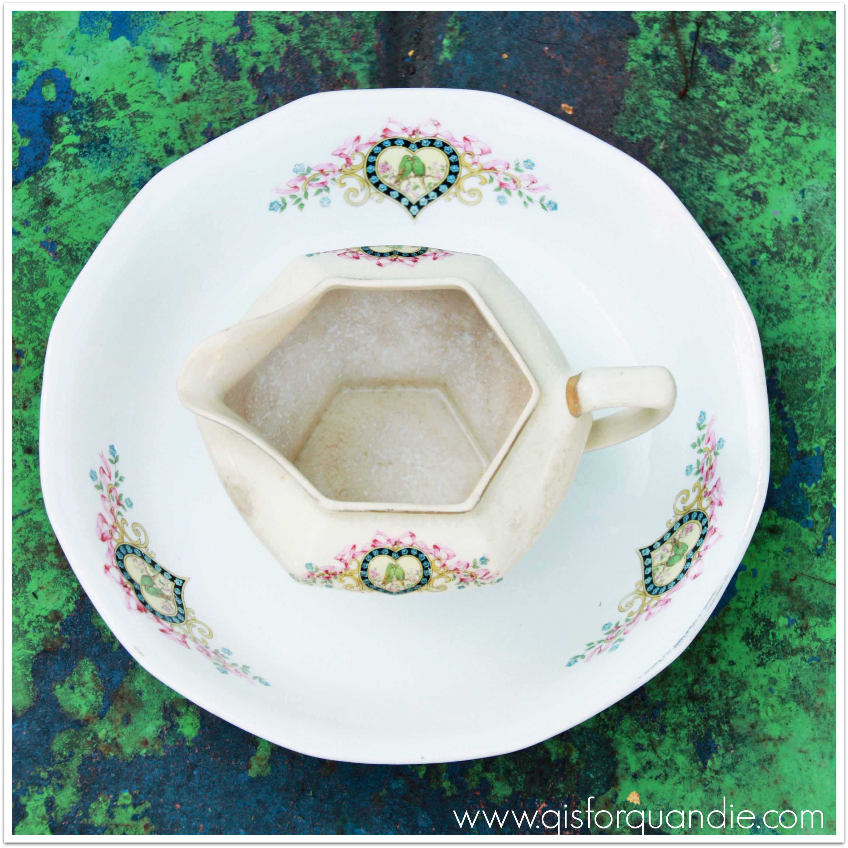 1. I know that it was manufactured by Atlas Globe China Co, but I can’t find a name for the pattern anywhere. There is a listing for this pattern at Replacements, Ltd, here, but no name given. Those green lovebirds are just charming, aren’t they? How lucky that you found even an incomplete set.