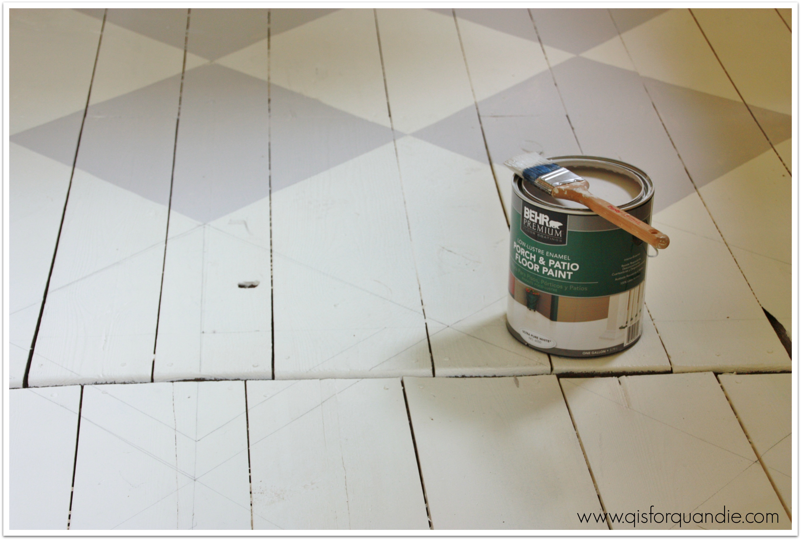 I’ve mentioned before that I don’t like to tape when I paint a floor. The taping takes so much time, and you go through so much tape. You also have to deal with bleed thru. Of course, you could tape it all, then paint with the base color again to prevent paint bleeding under the tape. But, then that is another step as well. Personally, I’d rather just draw the pattern on the floor and paint it in freehand. I have a pretty steady hand for this, but a good angled brush makes it fairly easy. Also, it really doesn’t have to be absolutely perfect in here.