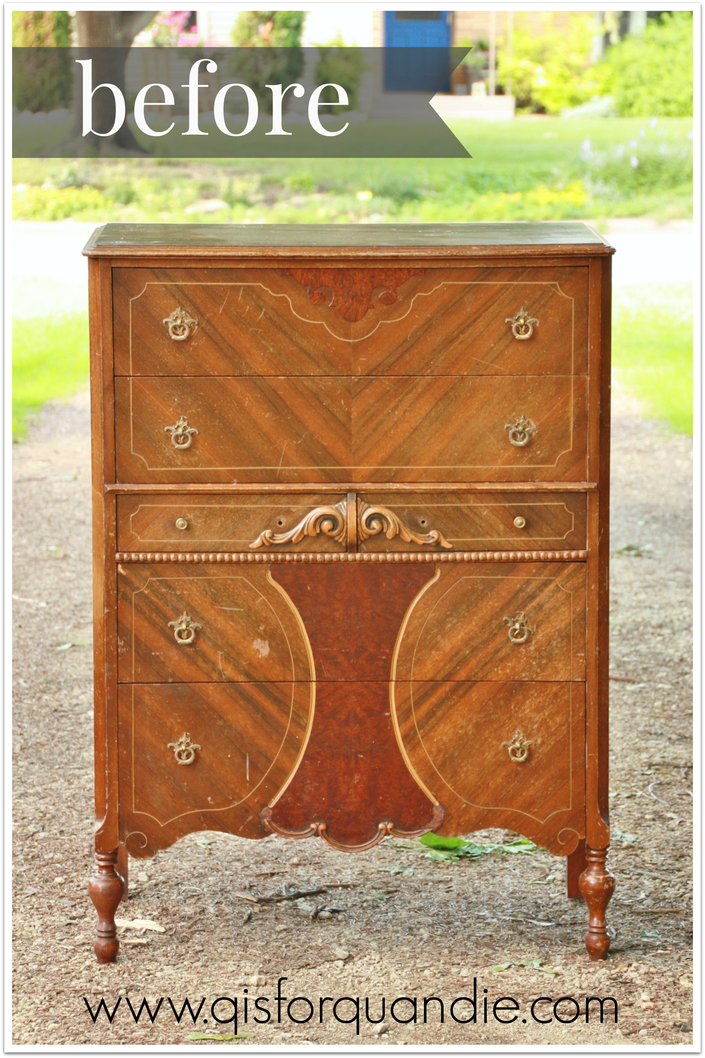 This dresser had fabulous written all over it.  Lucky for me, nnK spotted it on craigslist.  Obviously it was gorgeous in its day, but it was rather the worse for the wear.  The trim detail on the bottom had bits broken off.  There were scratches and dings everywhere.  A couple of the knobs were missing.  Really, it just wasn’t meeting its potential.