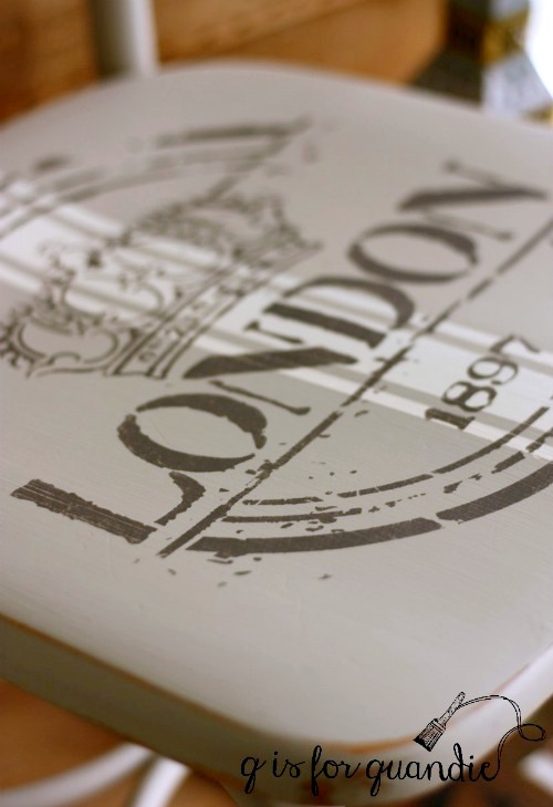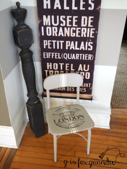 The grain sack stripes totoally make this chair…and then the stencil on top is the extra “oompf” (or however that’s spelled!). This chair would fit just a bout anywhere now…good job!