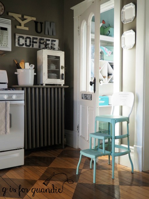 I really liked the stool. Maybe something I will look for this garage sale season. I agree with Kim on the rust line. Above and below the imaginary wainscoting line.