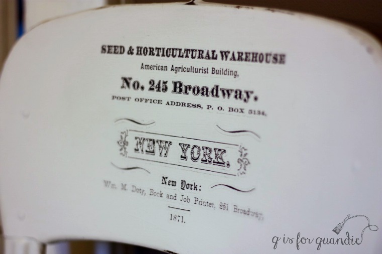As I studied the ‘finished’ stool, I really felt like it needed just a little something more. So I pulled out my Iron Orchid Designs transfers. The bottom section of the small “Richardson Seeds” transfer was a perfect fit for the seat back (I used the full transfer on the green window recently). This is another of the cool things about these transfers, you can use just a portion of one and save the other part for another project.