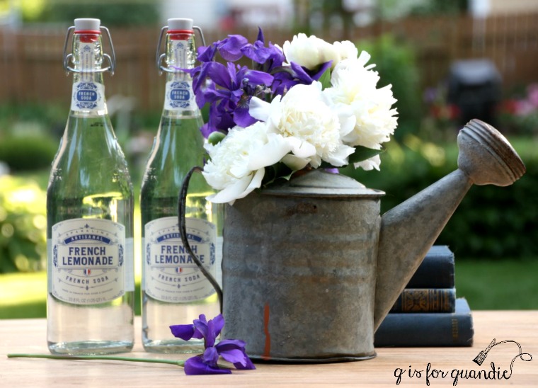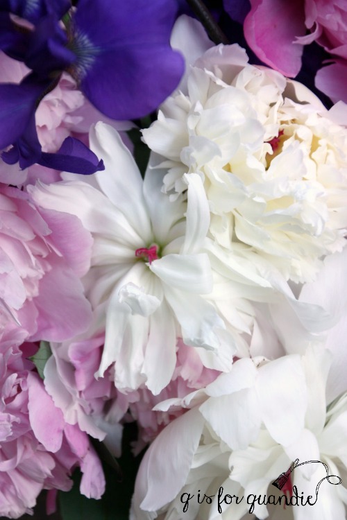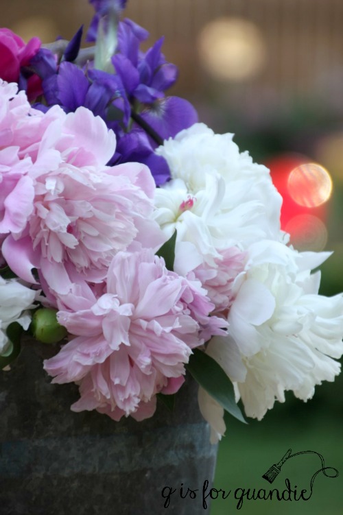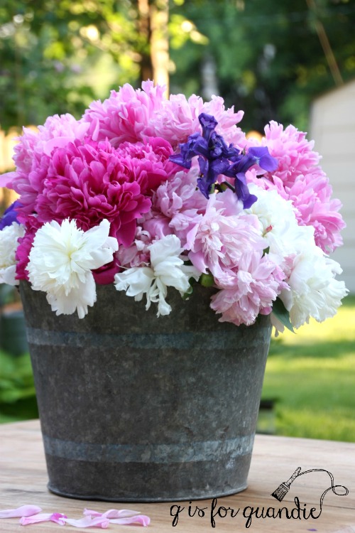 I liked the subtle blue stripe on the galvanized bucket.  I filled it up with peonies for a photo.