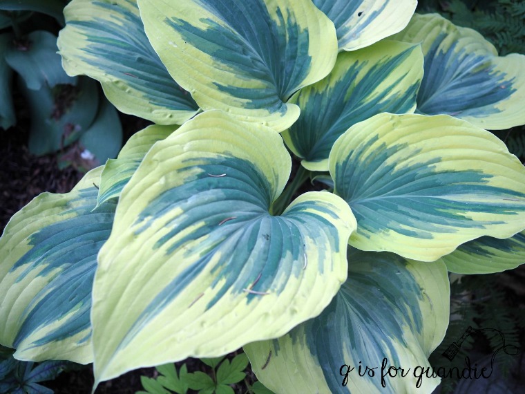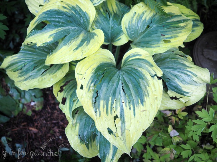 The peonies were not the only things to suffer from Sunday’s hail storm.  My gardens were really looking pretty fantastic last week, so I took a bunch of photos including this picture of one of my favorite hostas.