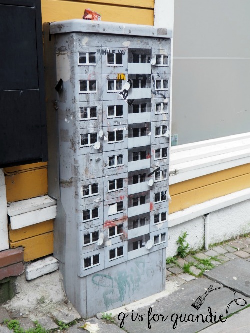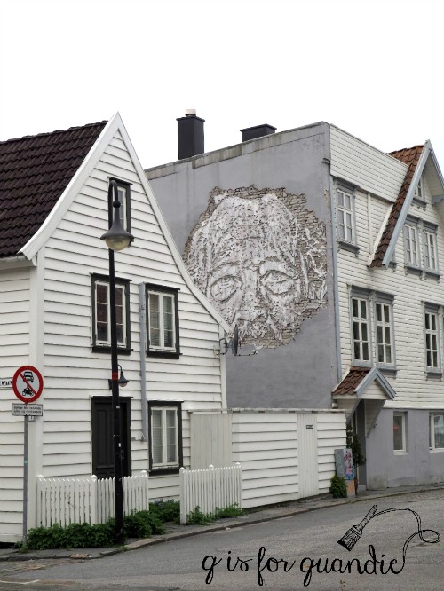 Although Mr. Q pretty much indulged me and was very patient about wandering around charming old wooden houses in Gamle Stavanger on our recent trip, he’d pretty much had enough of that after a couple of hours. That was when we headed into the Tourist Information center that was located right next to our ship and found a postcard about the Stavanger Street Art walking tour.