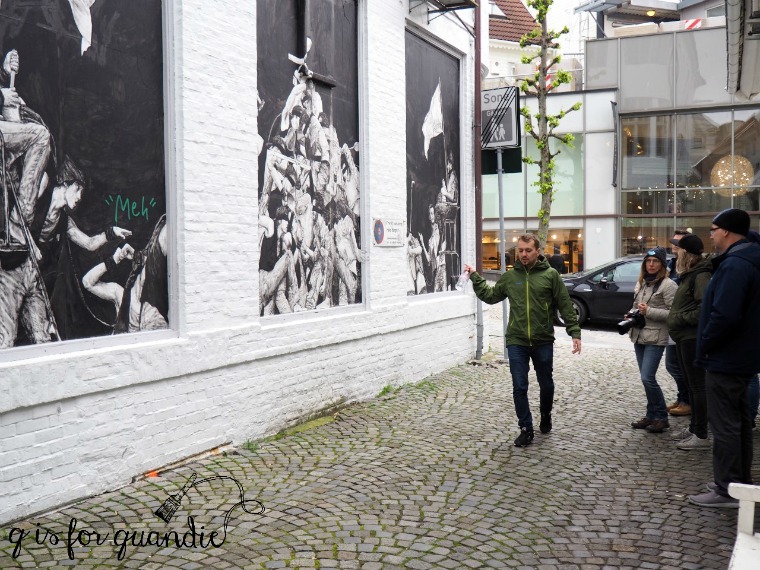 We purchased tickets for the tour right there at the tourist info center (it was about $36 for two) and then headed back to the ship for a quick lunch. Then Mr. Q and I headed back to the TI to meet our tour guide. We were starting to wonder if we were in the right place because there were only two other people waiting, but our guide showed up and we realized the four of us were it. The other two people on the tour were a writer and a photographer from Portugal who were doing an article on the Stavanger street art scene for a magazine. A little later we were joined by two more ‘tour guide trainees’ who were learning from our guide, Michael (in the green jacket).
