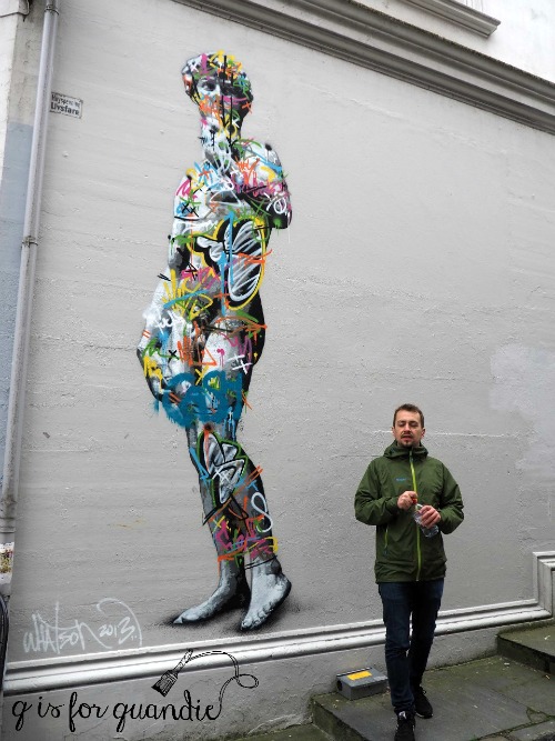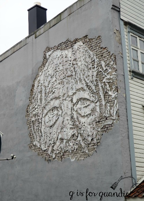 Although Mr. Q pretty much indulged me and was very patient about wandering around charming old wooden houses in Gamle Stavanger on our recent trip, he’d pretty much had enough of that after a couple of hours. That was when we headed into the Tourist Information center that was located right next to our ship and found a postcard about the Stavanger Street Art walking tour.