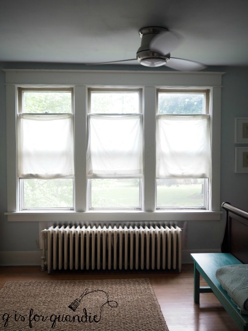 I’ve had many different treatments on these windows over the years.  I’ve had wood slat blinds, bamboo roman shades, roller shades, fabric curtains on a rod, yada, yada, yada.  I really struggle with window treatments.  For the most part, I don’t like them.  I would prefer to have nothing at all, but that’s just not possible in a bedroom that faces the street, as well as the house across the street.  I’m sure nnK would prefer we have some kind of window covering.