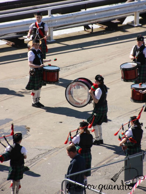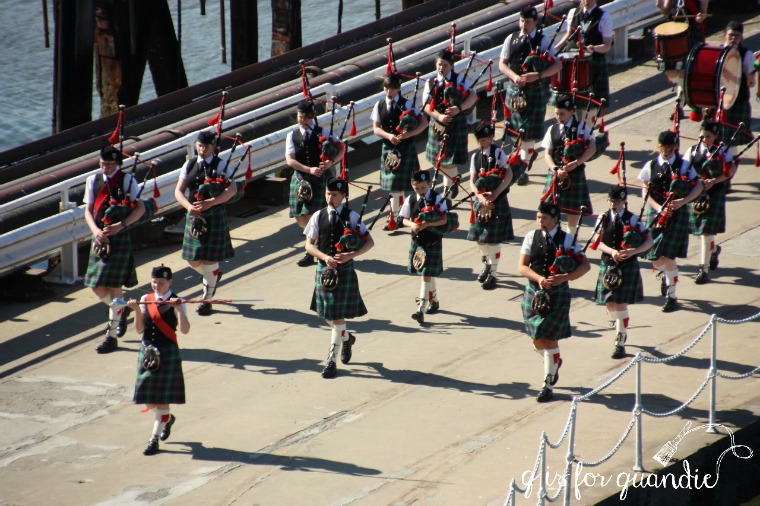 After spending a totally enjoyable 6+ hours with our guide, I thought that our day could not possibly get any better. We had just returned to our cabin on the ship and were putting away our bags when I heard what sounded like distant bag pipes. I went out on our balcony and was met with the most amazing sight. An entire band of bagpipers and drummers marching down the pier towards our ship.