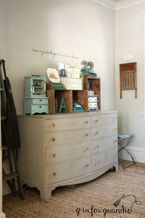 The dresser that I currently have in that spot is very functional, it holds lots of crafting supplies and camera paraphernalia.  There isn’t anything wrong with it, but I don’t love it.  It’s a bit more traditional than I am.  Since it was functioning well, I wasn’t in a hurry to replace it, but it’s something that has been in the back of my mind for some time.
