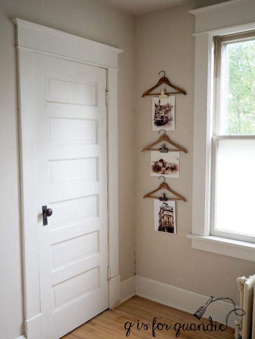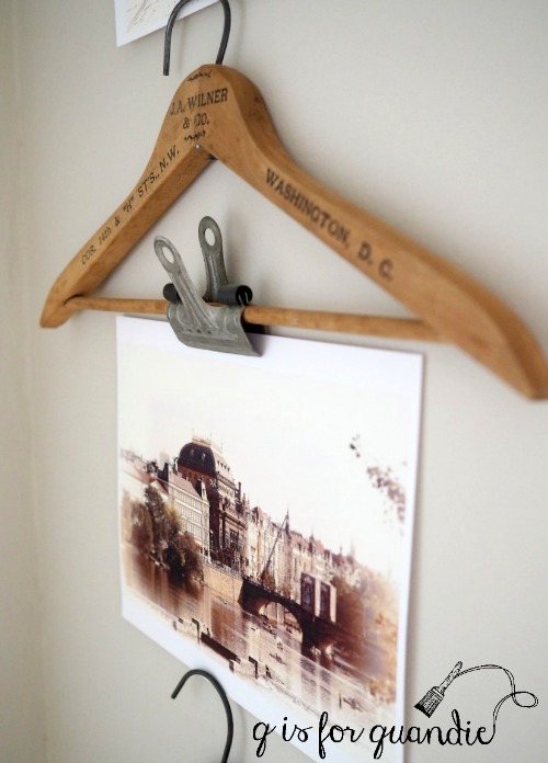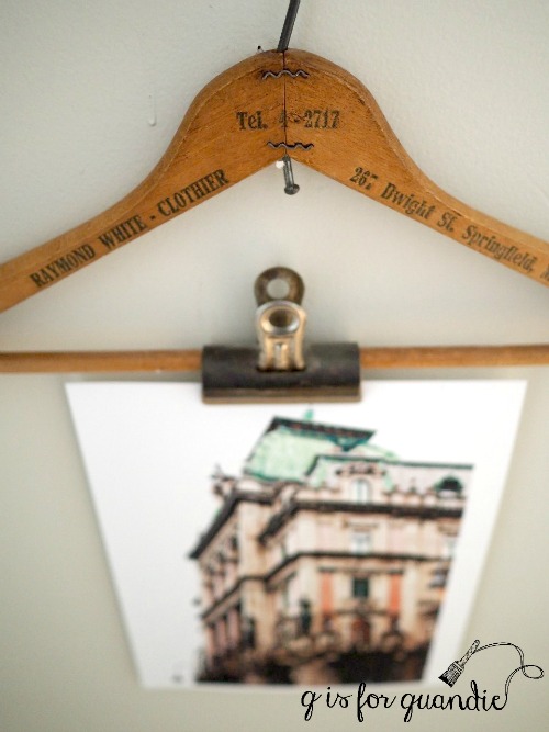 Then I gathered up some vintage metal clips (another thing I like to grab whenever I see them at garage sales) and simply clipped the photos to the hangers.