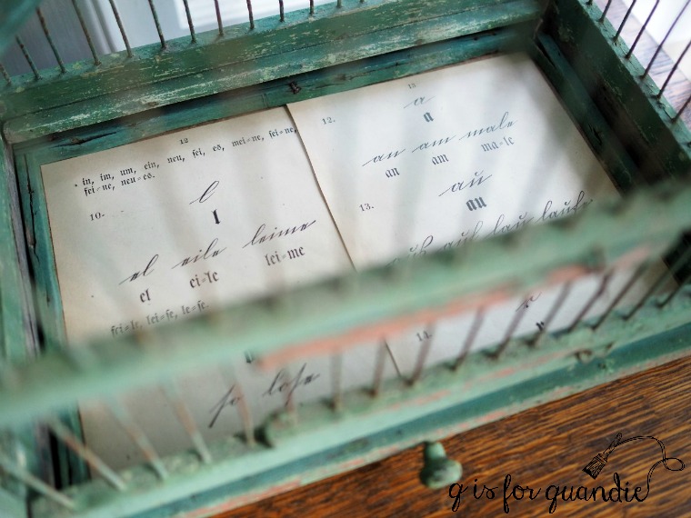 When I got it home I immediately replaced the scrapbook paper that was lining the bottom with some pages from an old German book that I purchased at Carver Junk Co.