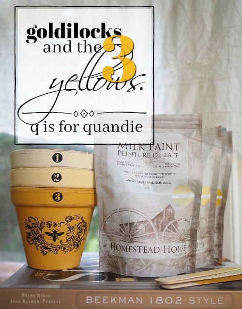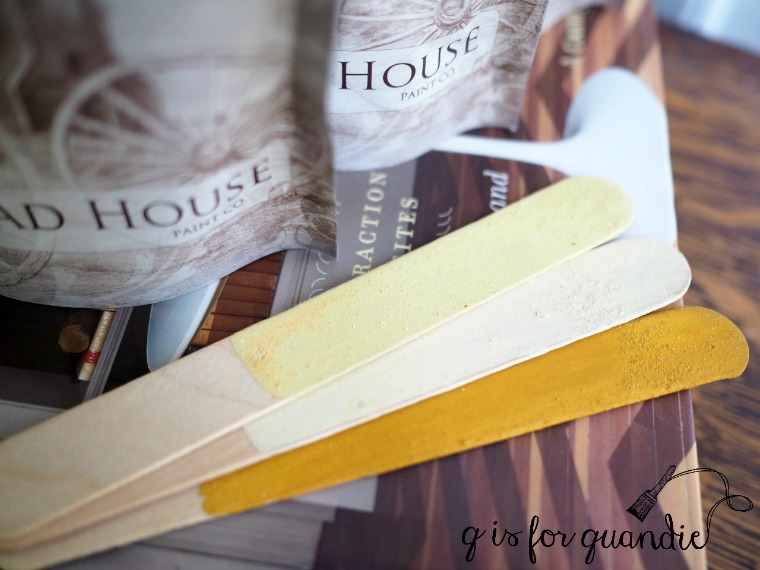 A while back the lovely people at Homestead House gifted me with some of their milk paint in several shades of yellow; Buttermilk Cream (check out this dresser that I painted in the Buttermilk Cream), Ochre, and Garden Seed. Since the Buttermilk Cream is the only one I’ve used before, I decided to mix up just a bit of each of the other colors and paint them on popsicle sticks to decide which one would be right for my bed.