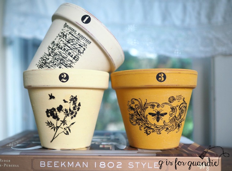 Then, since the pots were pretty plain I added some Tim Holtz rub-ons to them to dress them up a bit.