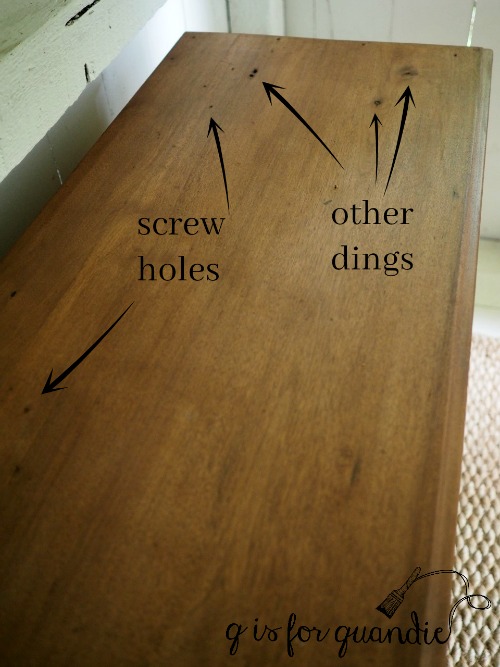 You might be wondering if that meant there were screw holes in the dresser top, and yes, there were … or more correctly there are.  I just left them.  They were small, and the wood top of the dresser had plenty of dings and other blemishes.  I like to embrace those rather than try to hide them.  Since I gave the dresser top a rustic waxed finish the dings just blend right in.
