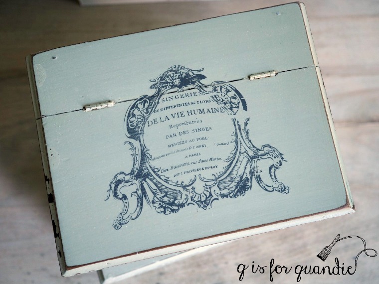 Next I added some Iron Orchid Designs transfers to the tops of the boxes.  Both are from their French Pots line and are intended to be used on clay pots, but I have found any number of other great uses for them!