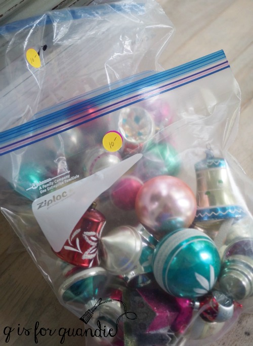 Unluckily for me, the ornaments were sorted into Ziploc bags (again with the Ziplocs!), fab vintage ornaments mixed with junky tacky ornaments. And they were priced at $10 per bag, a little steep. But then I did a little math in my head, each bag had around a dozen good ornaments mixed in with 4 or 5 bad ones. So even though $10 felt high, it was less than $1 per ornament, so I grabbed two bags.