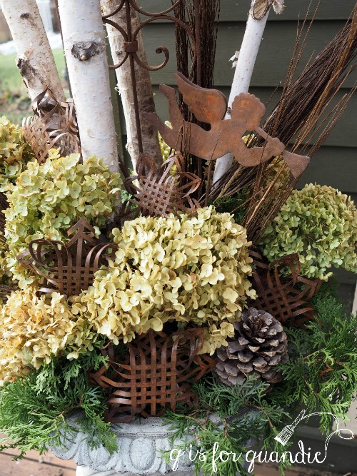 I used some birch logs and some rusty metal ornaments that I already had, plus the same arborvitae and dried hydrangeas from my garden.