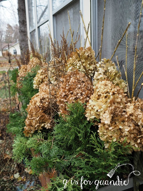 I always clip my own spruce trees in the yard to get mine. I owe you for all the plants you gave me from your yard so next year I’ll have to bring you some. I tucked those in the back of the planter, added juniper branches I trimmed off the bush in front and then in the front, I used my dried sedum heads that I cut down. It looks so pretty and cost nothing at all. Yours is beautiful too. I might have to grab some of my hydrangea heads I have drying in the garage.