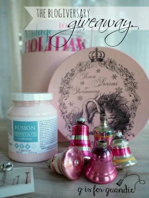 As I mentioned at the start of this post, it wouldn’t be a blogiversary without a giveaway right?! I wish I could just send this gift to each and every one of you, but that isn’t possible so instead I will draw a name at random from the comments left on this blog post by Thursday, November 30 at midnight (U.S. Central time). The winner will receive a Seven Swans a Swimming box, a copy of the issue of Vintage Holiday magazine with a story about my ornament non-collection, a jar of Fusion’s English Rose (provided by Fusion!), five vintage pink bell ornaments (crossing my fingers that they will arrive intact!), and a pretty hair pin I made using a pretty vintage earring. I might find a few other things to toss in as well.