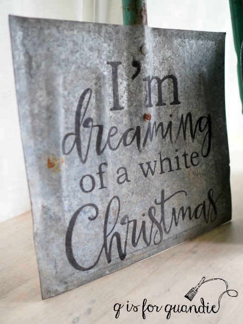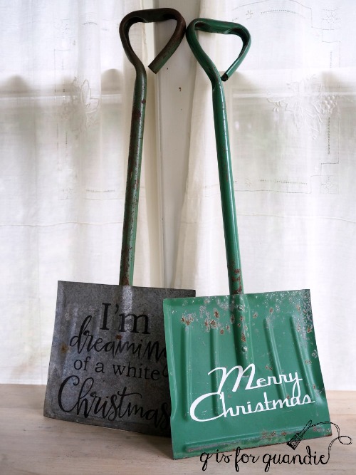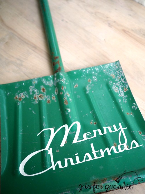 Next I purchased a green kid-size shovel from my friend Sue a few weeks ago.  She always has the best garage sale finds.  Unfortunately, I neglected to take a ‘before’ photo of it.  But I added a “Merry Christmas” in adhesive backed white vinyl that I cut on my Cricut machine.