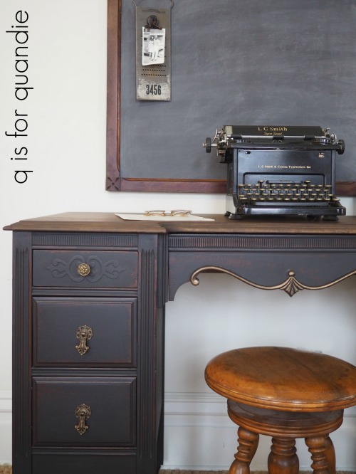 This.is.gorgeous. Love the accents and especially the little stool. The chalkboard over the desk is perfect. Another great Q piece is presented, and, as usual, I’m trying to figure out a home for it here. Lol