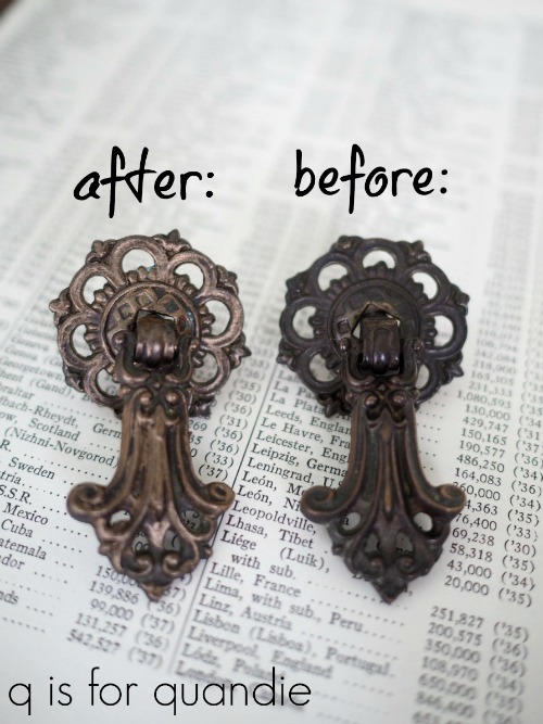 Oh, I just love this! The distressing and bronze accents are perfect! I’d even be willing to give up the desk I refinished myself for this one. But, alas, I am not in a position to add furniture to my moving van. I’m still flitting between states!