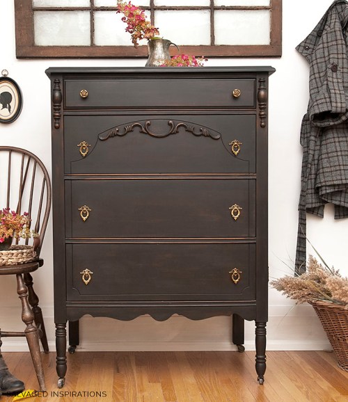 I decided to do a little research by looking at what other furniture painters that I admire are doing these days.  One of those painters is Denise at Salvaged Inspirations (be sure to check out her blog post today about painting with black).  She recently painted this gorgeous dresser in Dixie Belle chalk paint in a color called Caviar