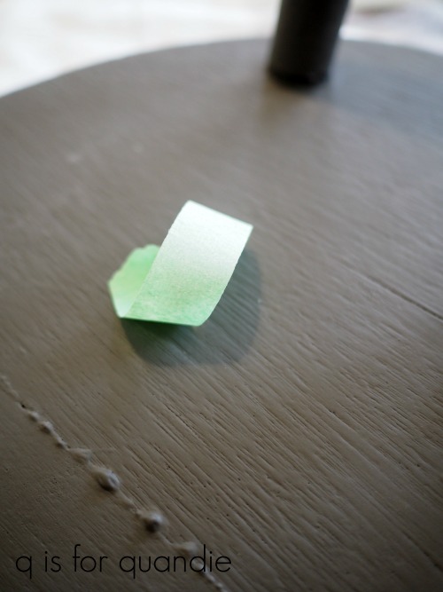 There are a couple of benefits to wet distressing.  First of all, you don’t create any dust.  This is a big plus when you are working indoors in the middle of winter.  Second, you can more easily control how far down you distress.  I didn’t want to see much of that original green color of this stool.  As soon as I could see the coat of Savannah Mist coming through I stopped rubbing.