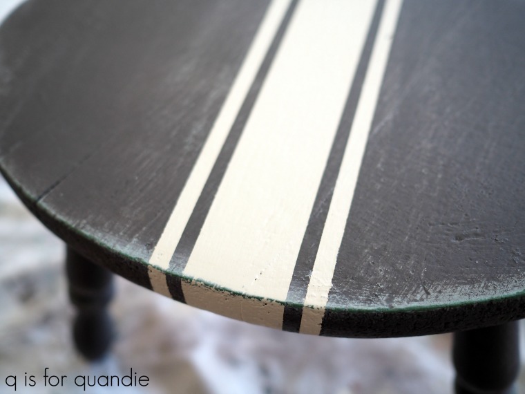 Since I was going to add some grain sack style stripes using tape next, I flipped over to the underside of one of the stools (which I had also painted) to test whether or not the tape would pull off any paint.