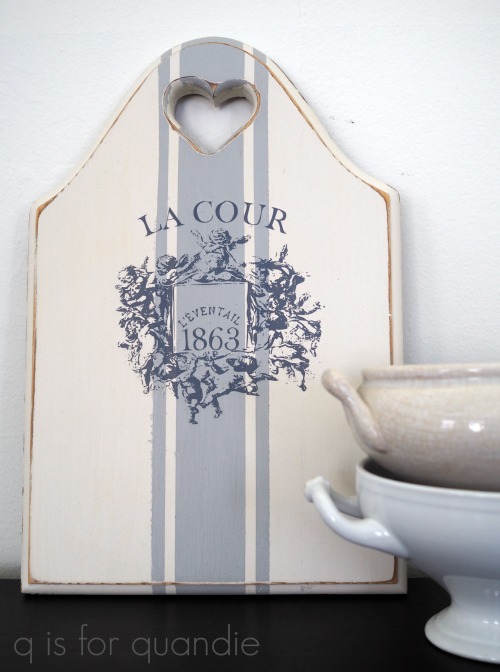 I removed the glued on words, sanded the entire thing down and then painted it in Dixie Belle’s Drop Cloth.  I added the grain sack stripe in Dixie Belle’s Driftwood.