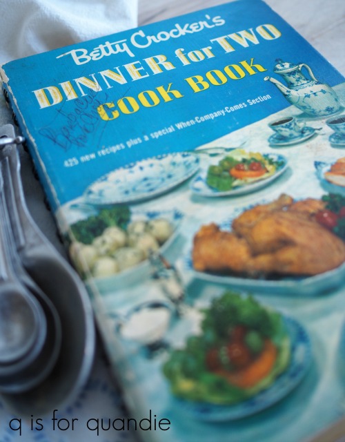 9. I wish I could attach a photo because you will not believe what I found yesterday after reading your post….I was trying to kill some time before dropping off a Valentine gift to my niece yesterday and waiting for her to get home from school. I have a thrift shop near me that is hit or miss. I don’t look at the books much but realize I really should keep an eye out for old cookbooks. As I was looking through shelves of their books with nothing much to even pull out to take second look at – something caught my eye that looked old….BETTY CROCKER’S DINNER FOR TWO!!! I KID YOU NOT!! Not one other old cookbook on the shelves. It is so sweet and small and the illustrations are just amazing and it is in great condition. After the clerk said, that will be .54 cents – I do believe I skipped to my car!!!