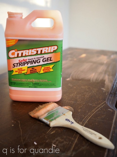 To prep your surface for lime waxing first strip off any existing finish.  I like to use Citristrip for this, but if you’re a sander instead of a stripper you can go that route too.  If you use a chemical stripper be sure to neutralize the surface with some vinegar water afterwards and then rinse with clear water.  Either way, you want to be sure to completely remove any previous finish.