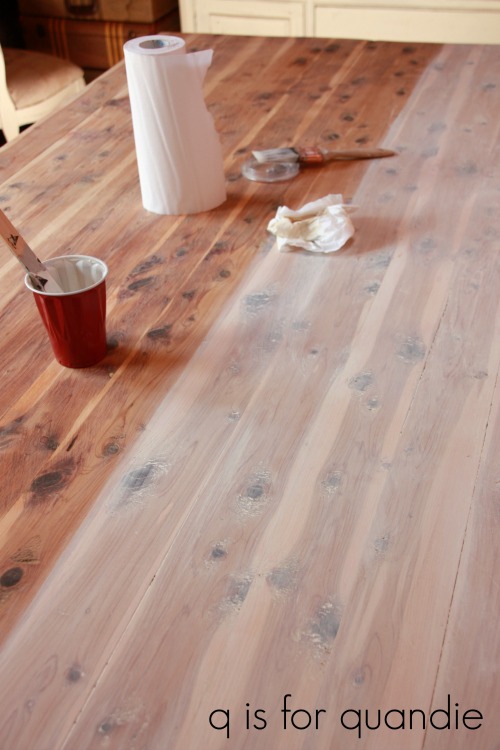 Next liberally apply the stain or watered down paint to your piece with a brush allowing a minute or two for it to soak in, then use a rag to wipe away the excess.  You’ll go through a lot of rags, so be sure to have them on hand and ready to go.  I used heavy duty paper towels when I white washed my cedar dining room table.
