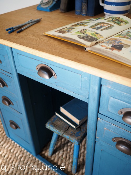 I also realized that I loved the contrast between the rich deep color of the Flow Blue and the pale wood top.  So rather than add stain or a dark wax to the top I simply waxed it with Miss Mustard Seed’s clear furniture wax.  In fact, the entire desk has a finish coat of the clear wax.