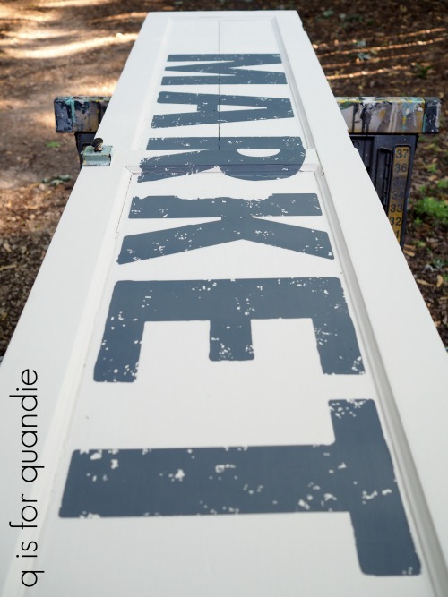 But first, the door had suffered a bit of damage over time and I wanted to eliminate the stenciled “1918” because that wouldn’t work for my sign. So I sanded the door down and added two coats of Dixie Belle’s Drop Cloth, a lovely warm white.