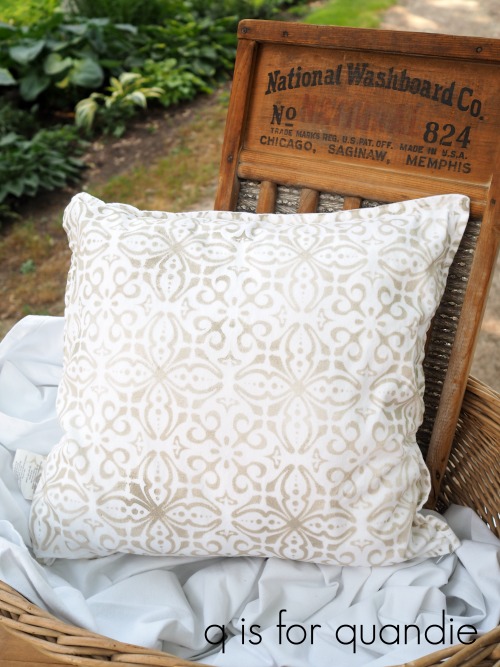 Another important tip, to keep your paint from bleeding through to the other side of something like this pillow cover, put a piece of cardboard inside before you stencil.  That will catch any paint that soaks through the fabric before it gets to the other side.