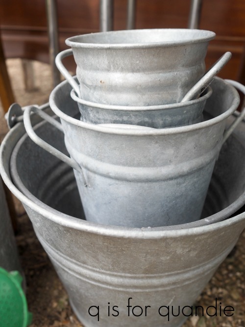 I found a pile of galvanized flower buckets at the first sale we stopped at, so I grabbed all of them.  These are always fun to paint or to add transfers to.
