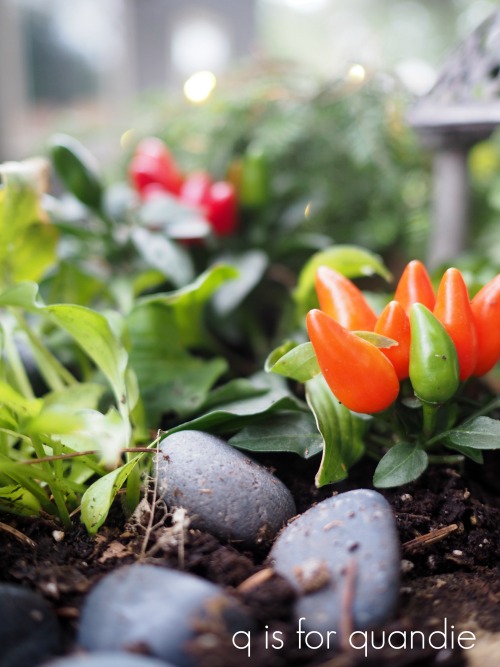 I also came across some tiny pepper plants in the miniature section at Bachman’s. Even though peppers don’t normally scream fall, I thought the red and orange coloring would lend an autumnal vibe.